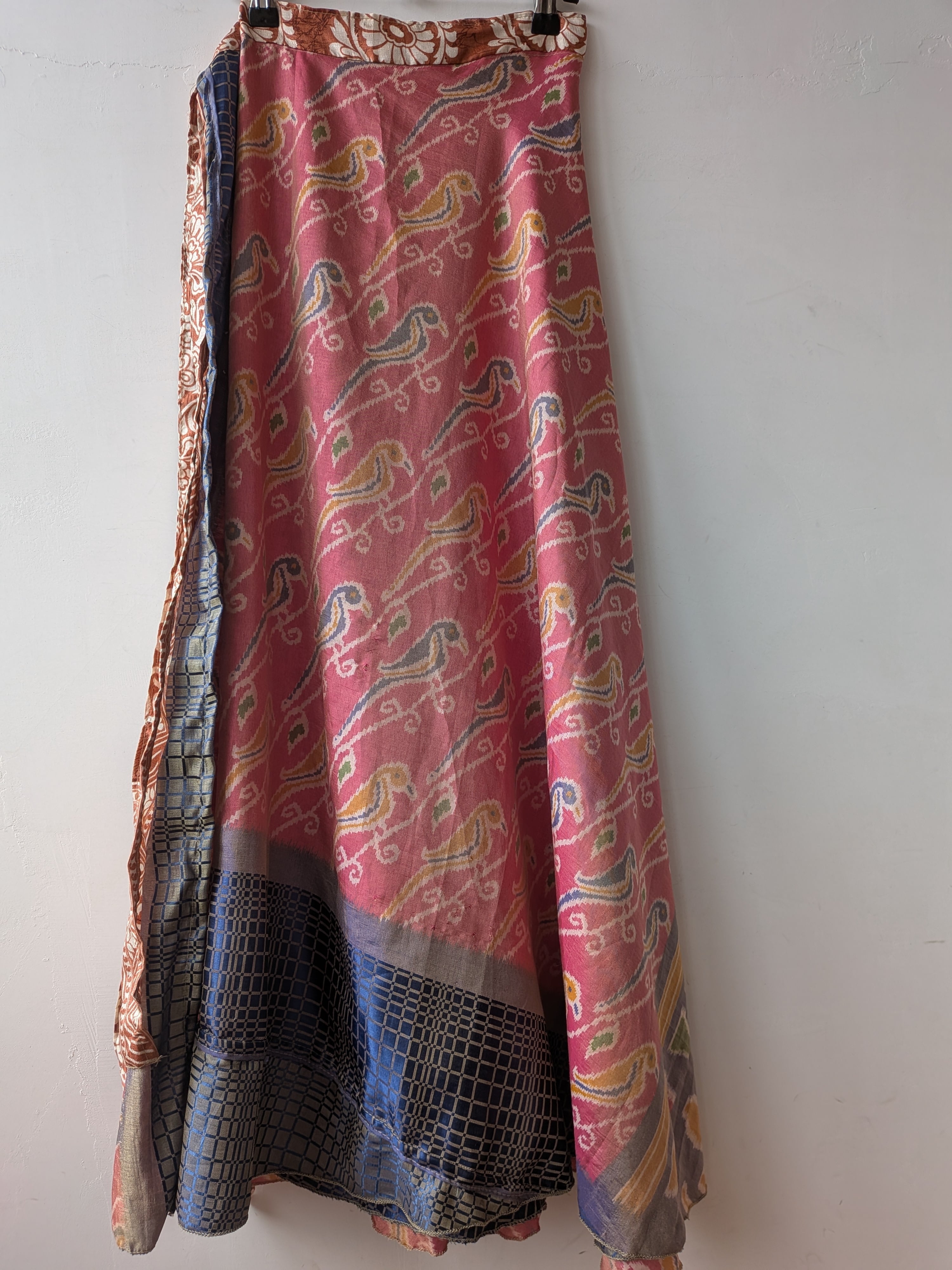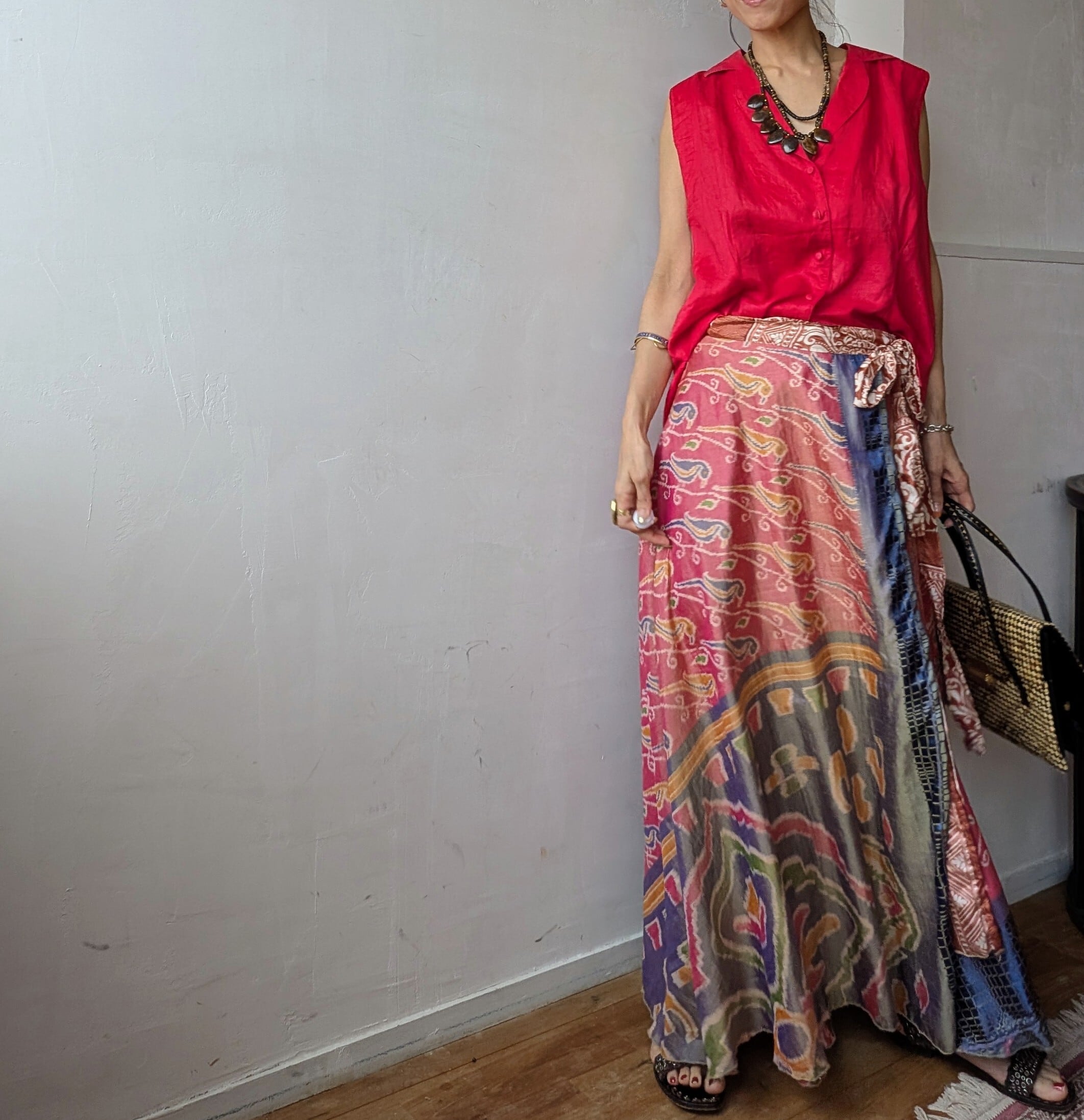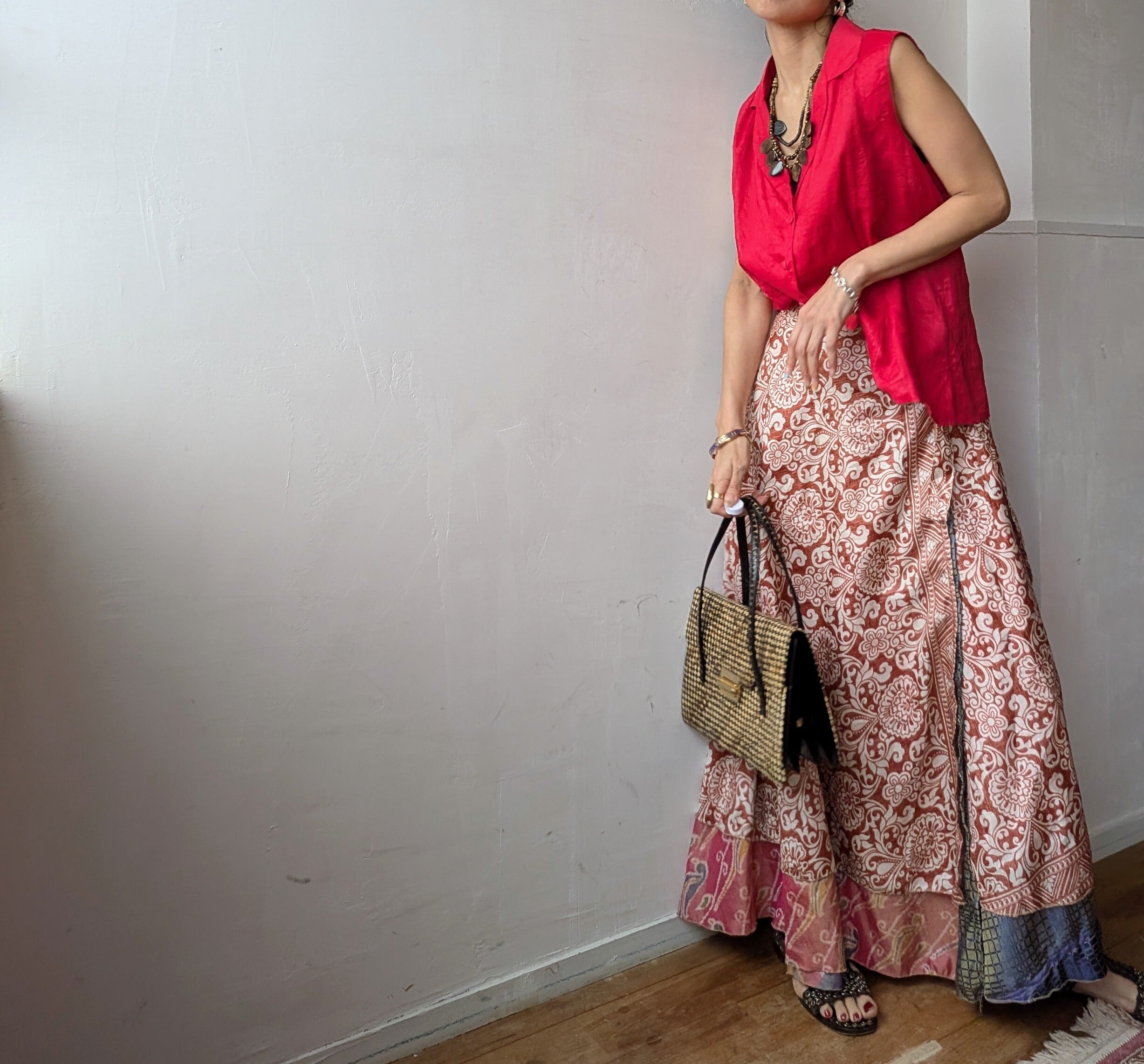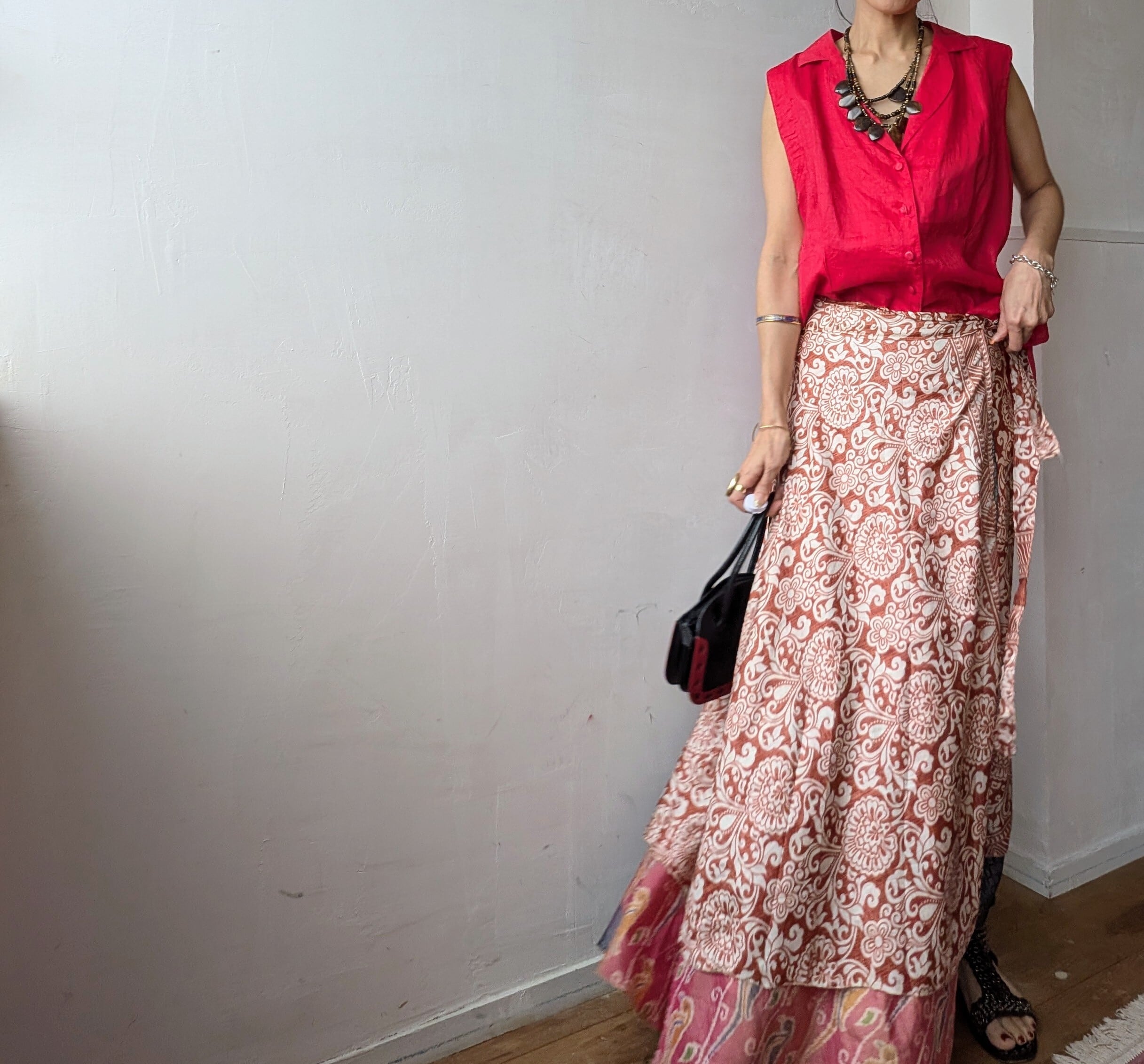 美しいインドの伝統が息づく、オールドサリーをリメイクした巻きスカートで、一枚ずつセレクトされたサリーから1点1点ハンドメイドで作られており、柄併せが個性的で、他にはない唯一無二の1点物です。