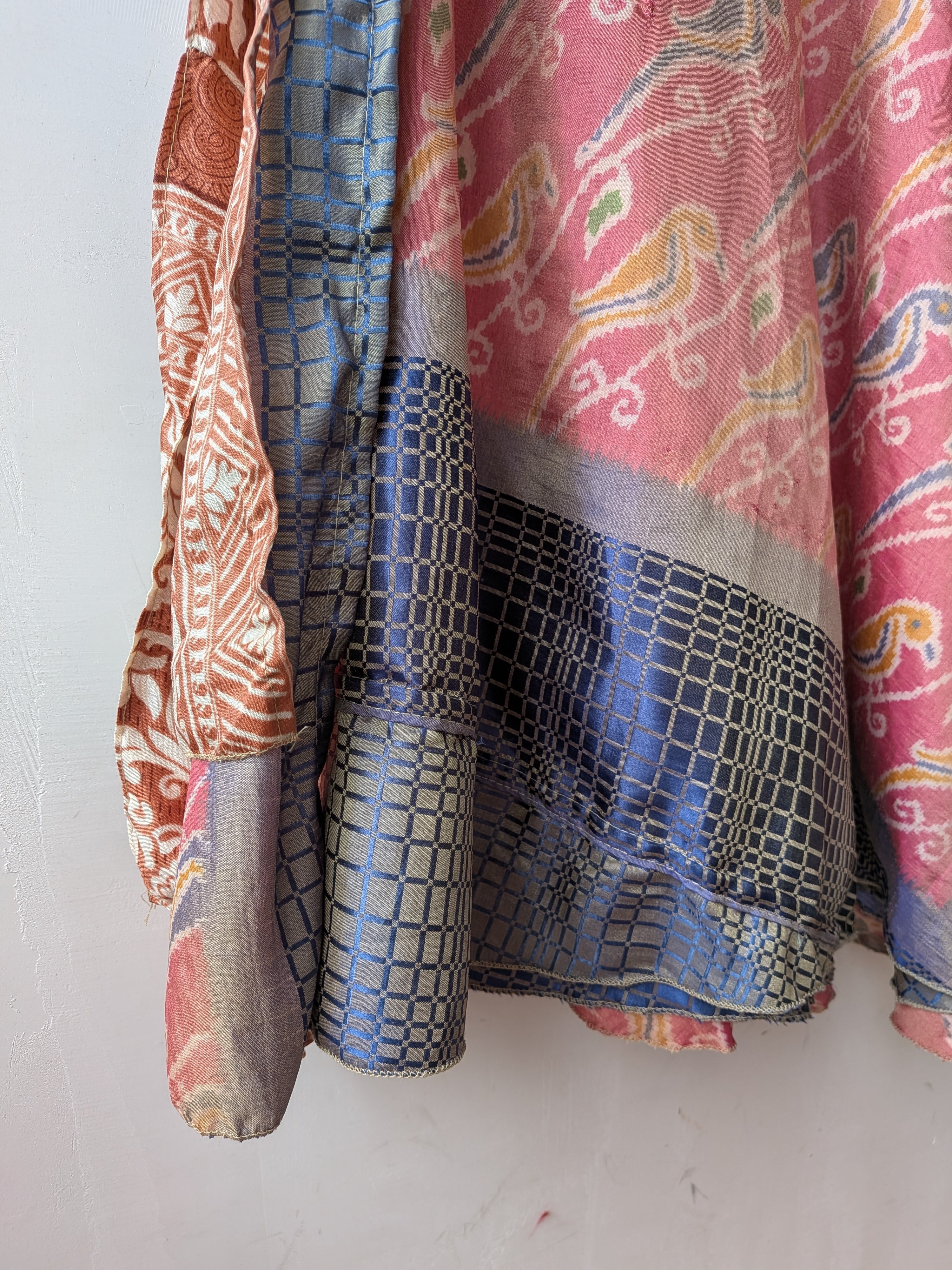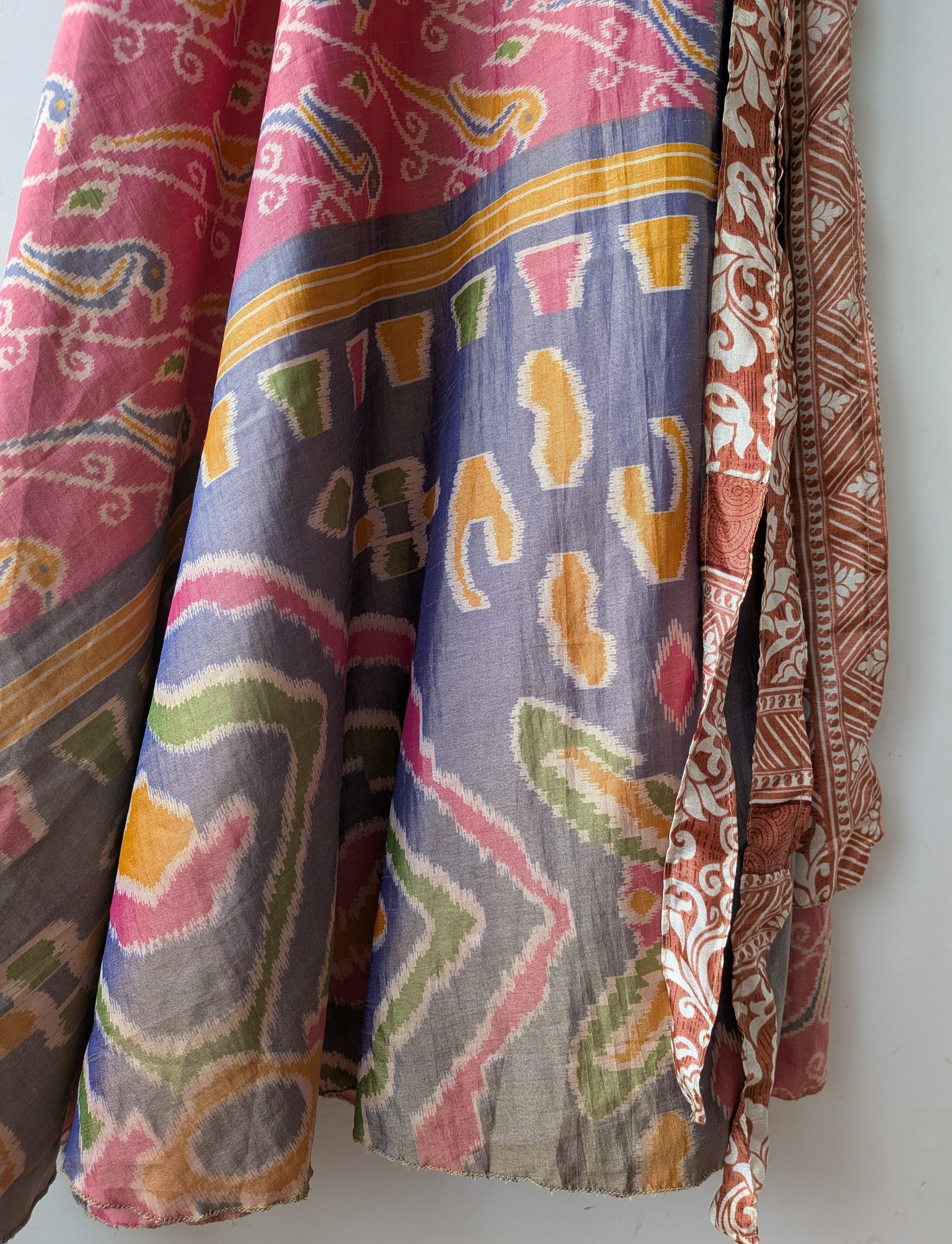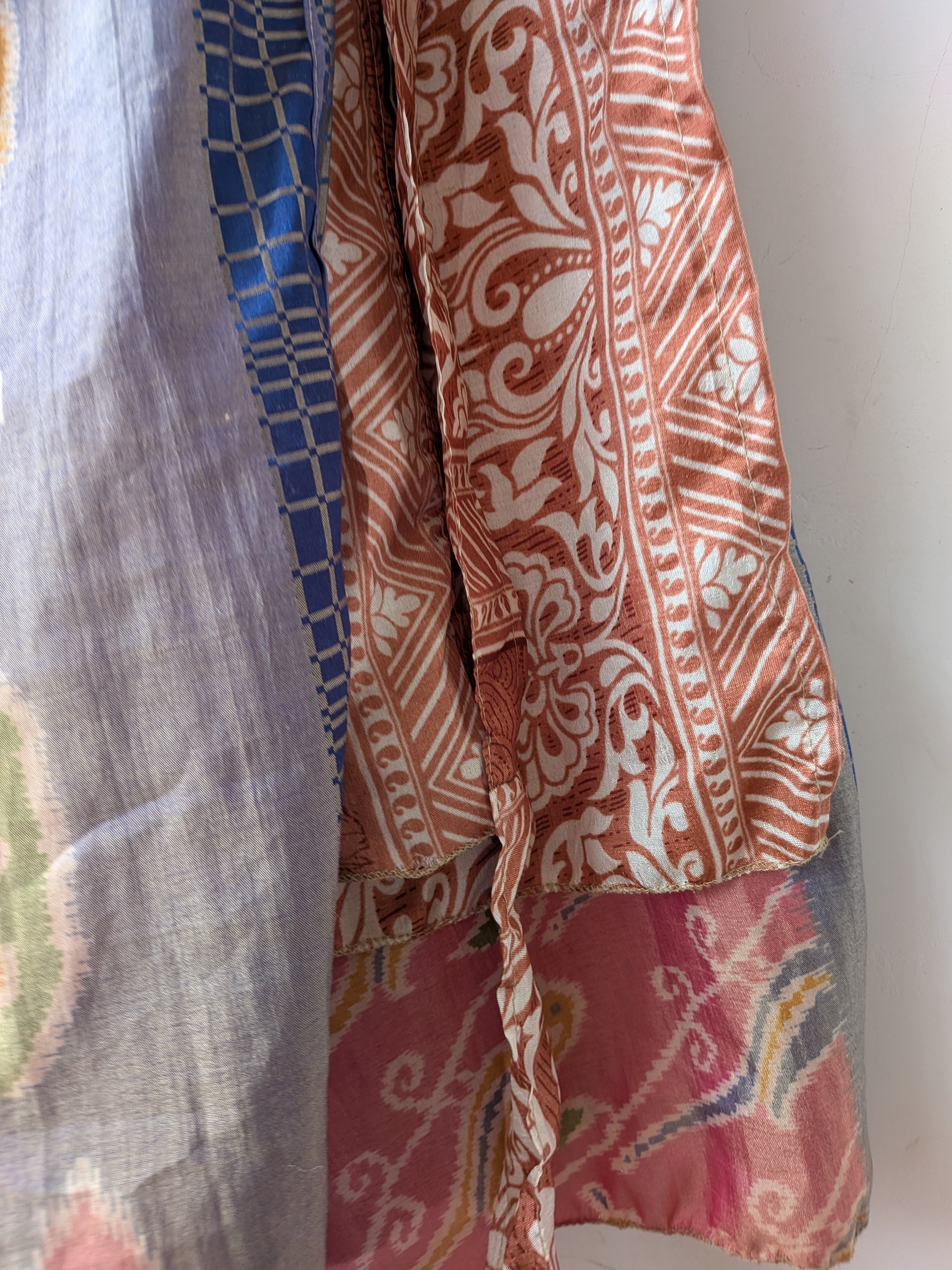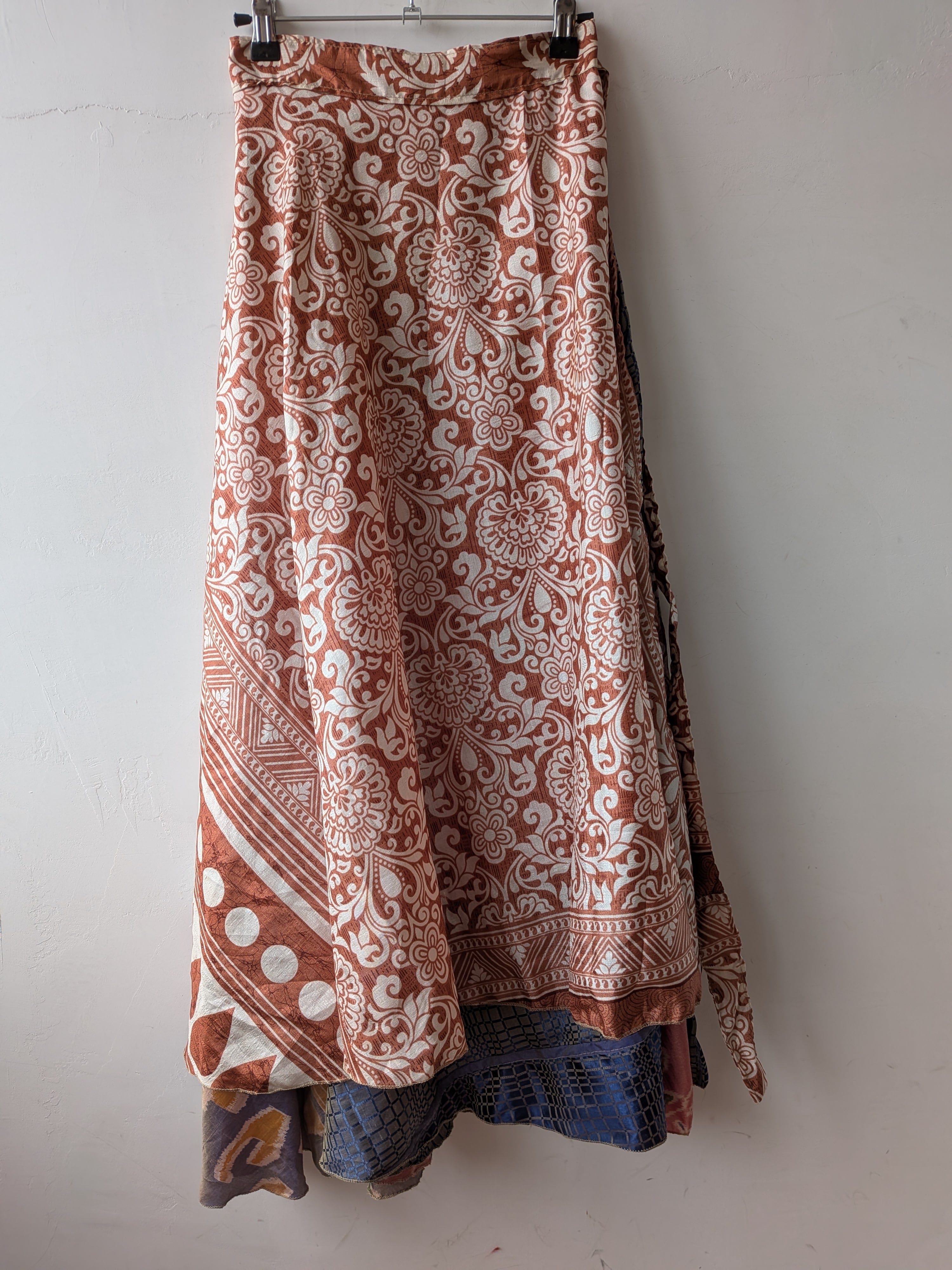 美しいインドの伝統が息づく、オールドサリーをリメイクした巻きスカートで、一枚ずつセレクトされたサリーから1点1点ハンドメイドで作られており、柄併せが個性的で、他にはない唯一無二の1点物です。