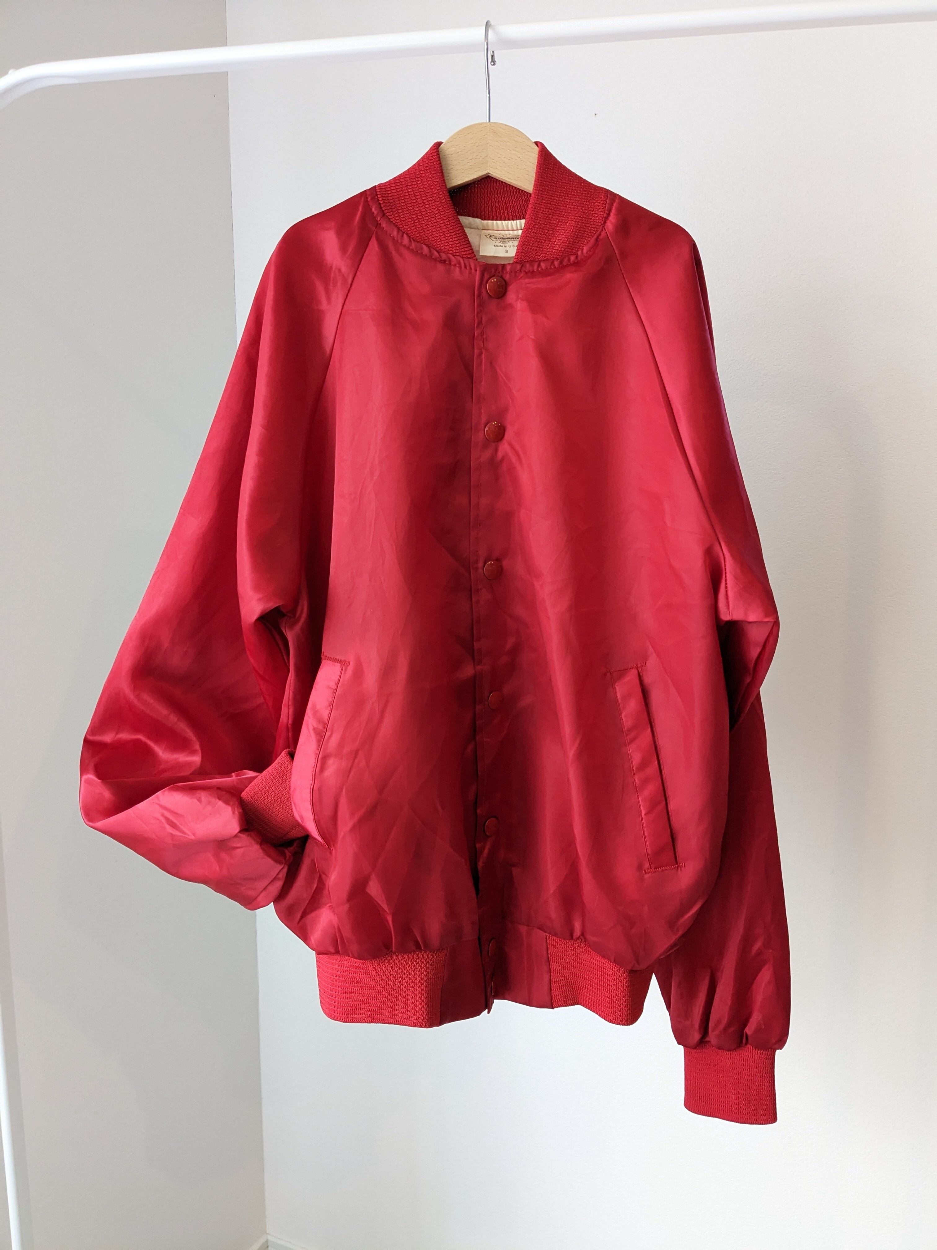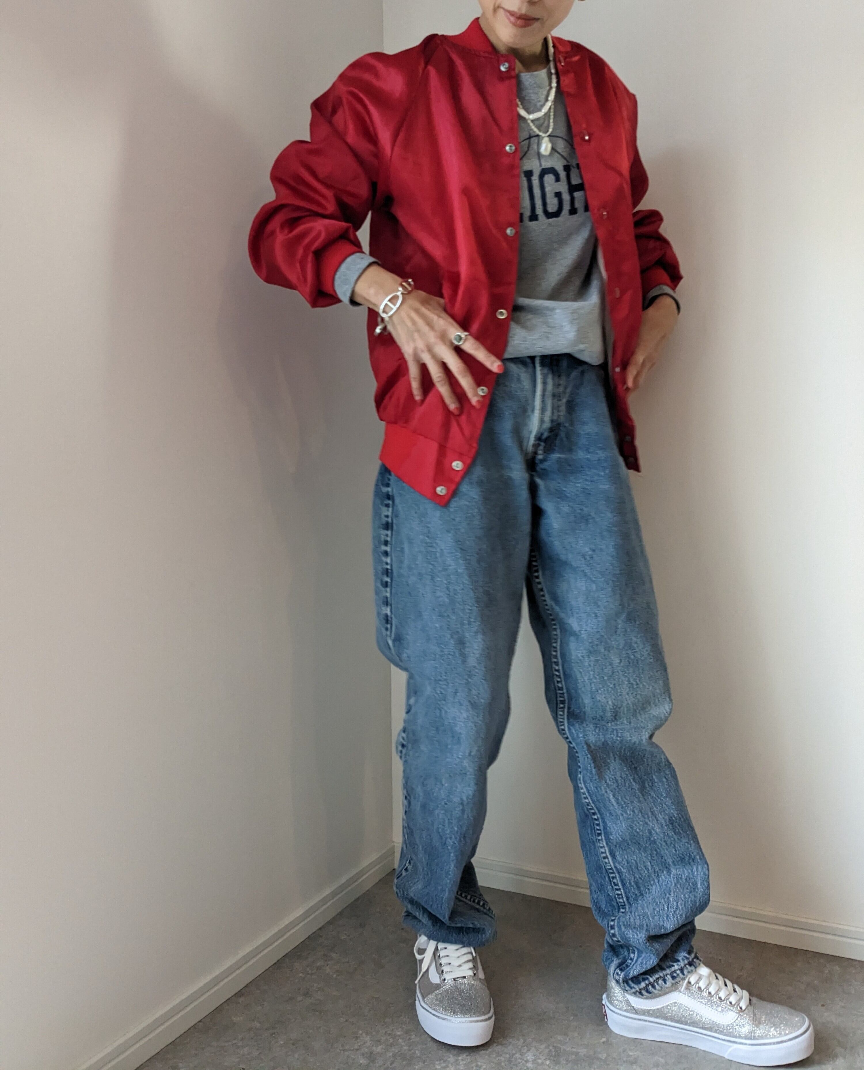 サテン地のような光沢が女性でも併せていだきやすい、かっこいいスタジャンです。
