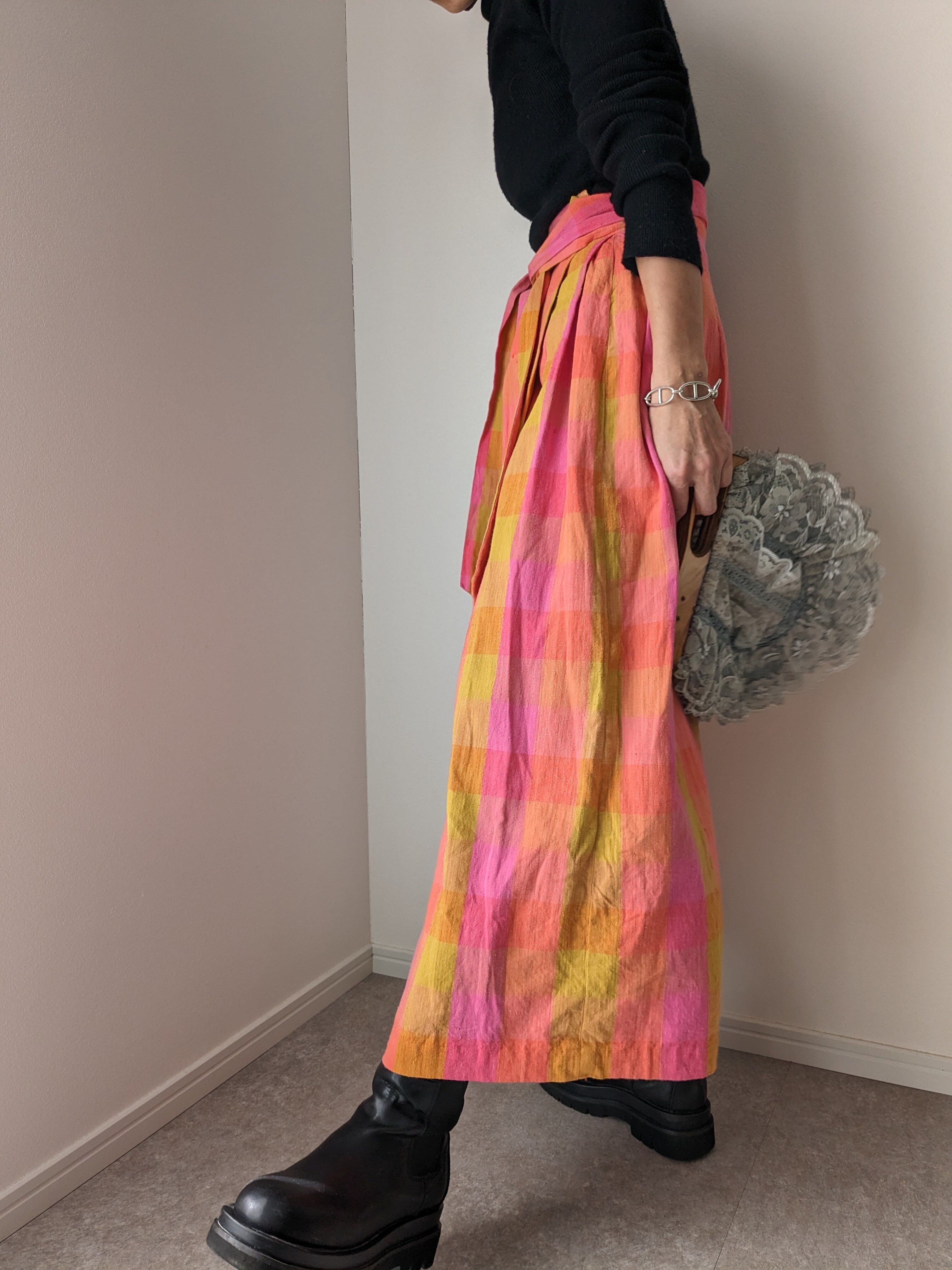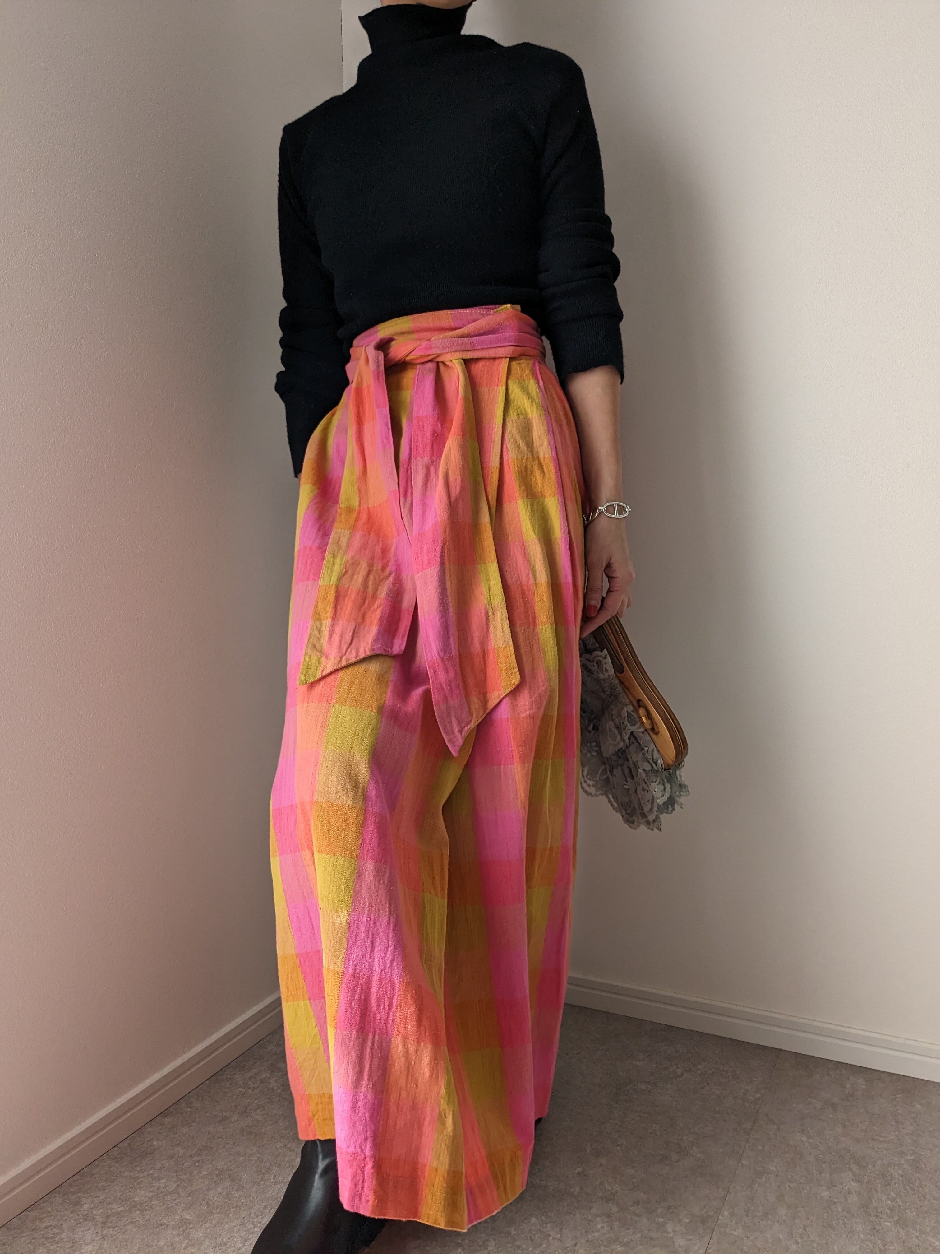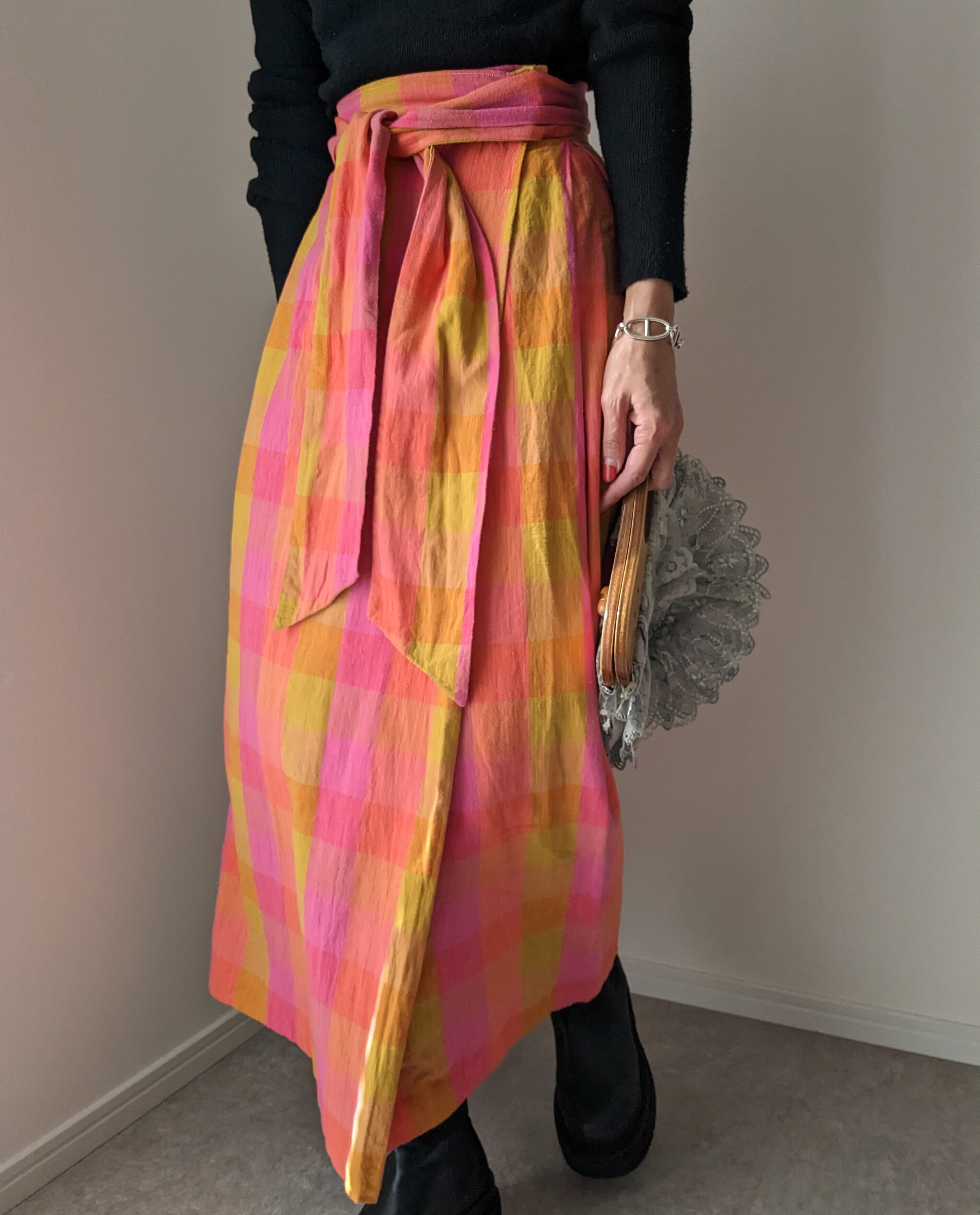 年代物ですが、大判チェックや明るいカラー、ウエストの太めのリボン。今のトレンドとしても十分すぎるほど素敵なデザイン。オールシーズン着用いただけます。