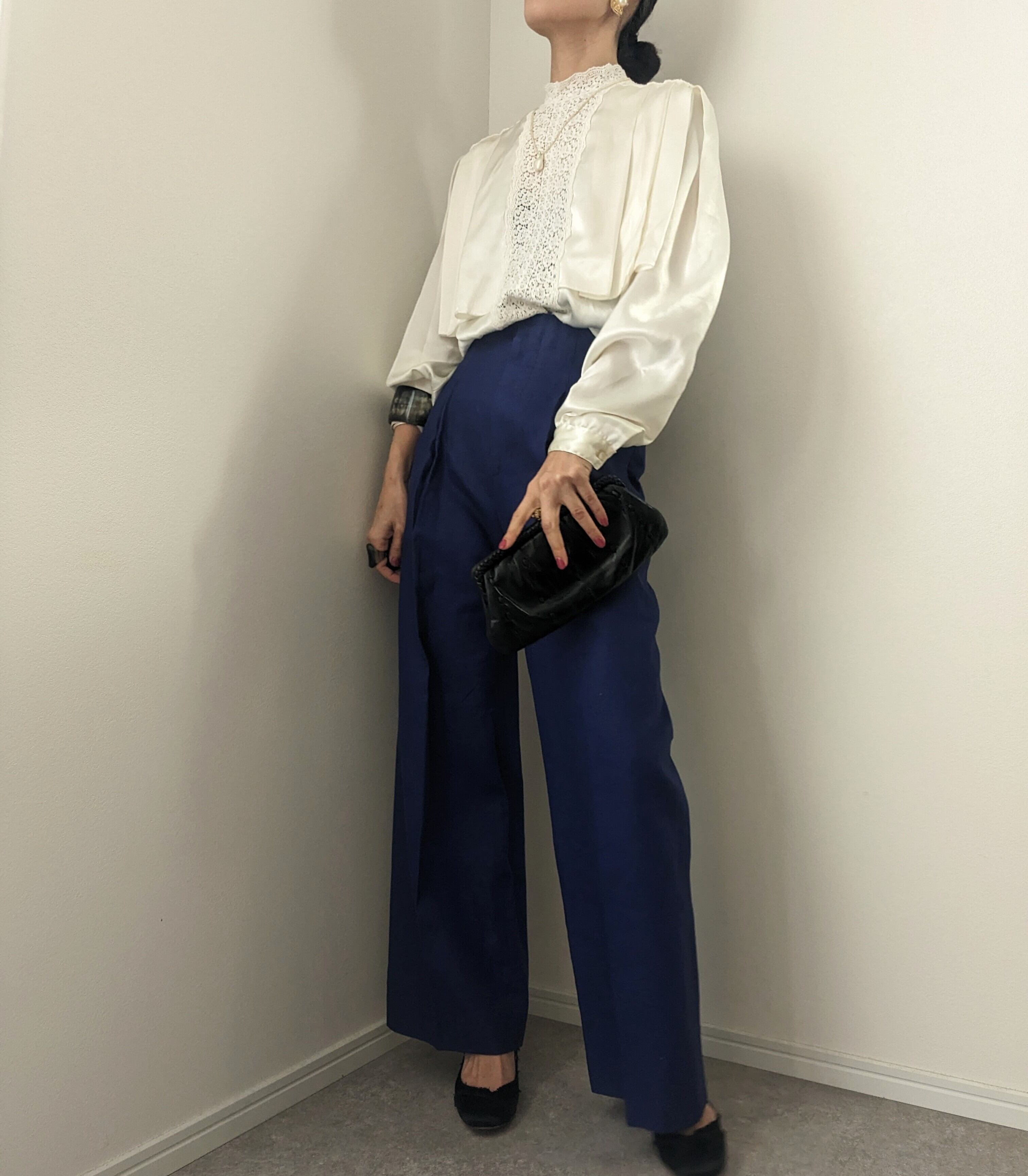 とろみのあるサテン生地とレースのコンビが大人な雰囲気のブラウス。