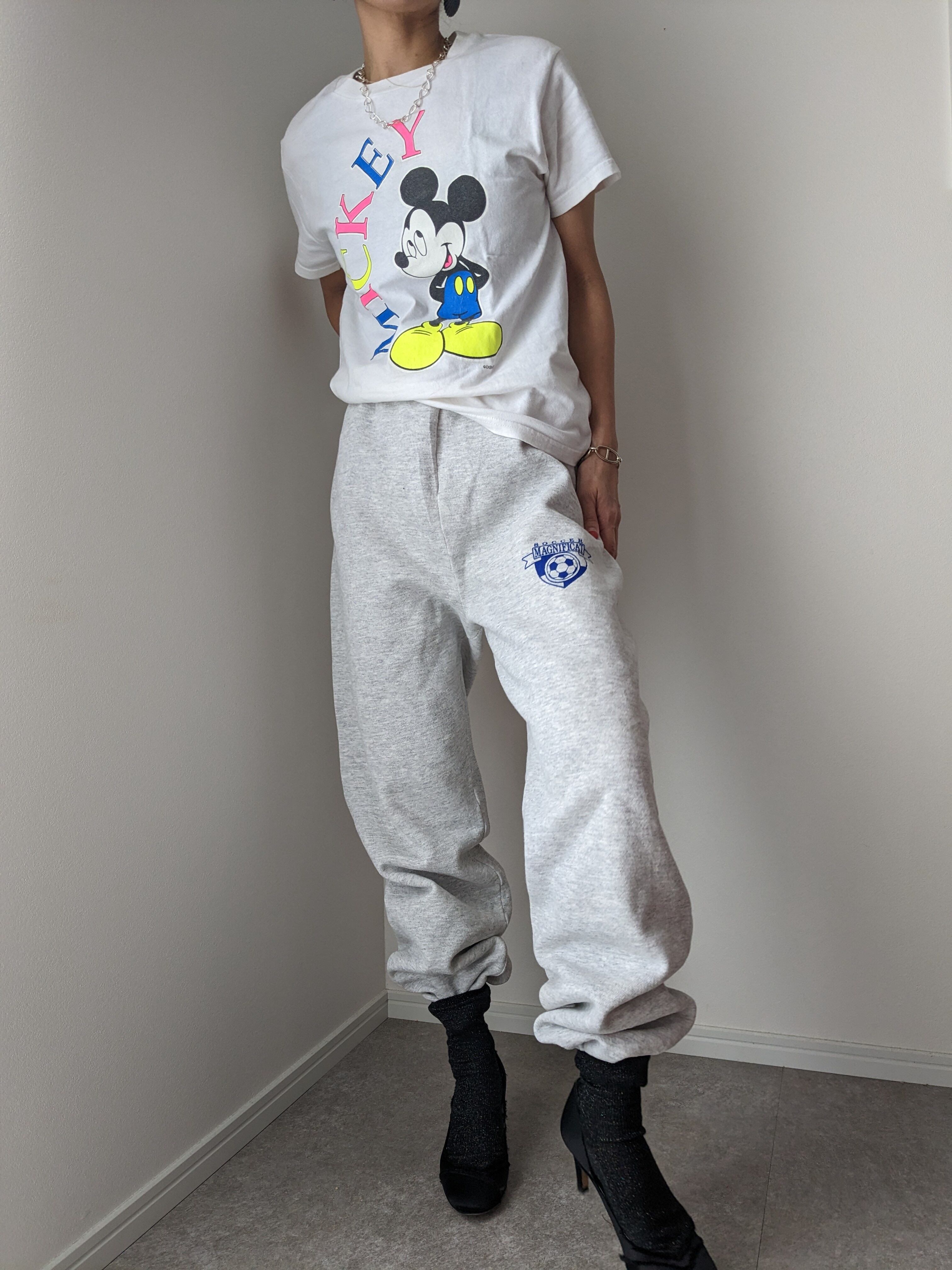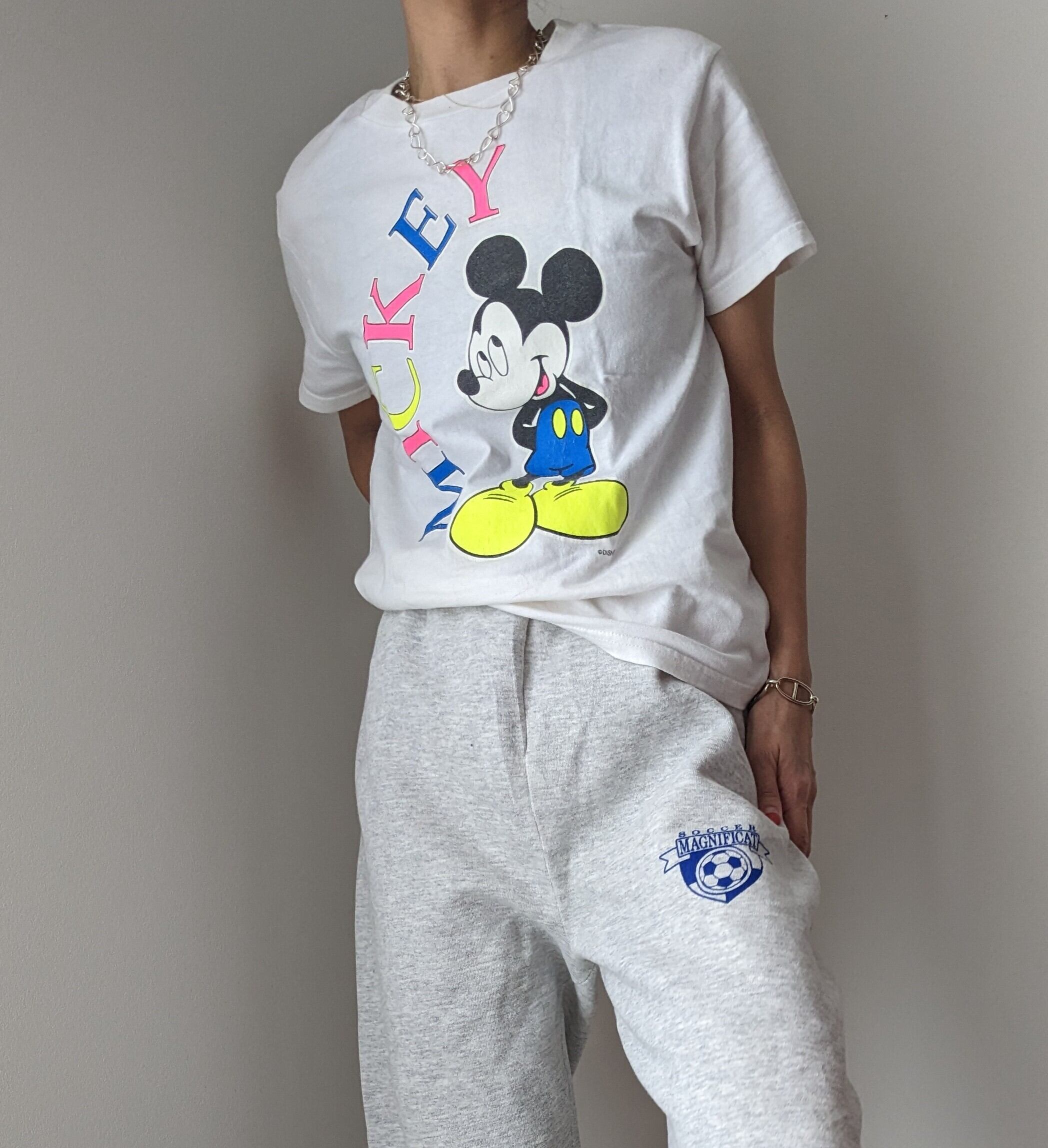 ネオンカラーのロゴとUSAらしいミッキーがフロントにプリントされたtシャツ。