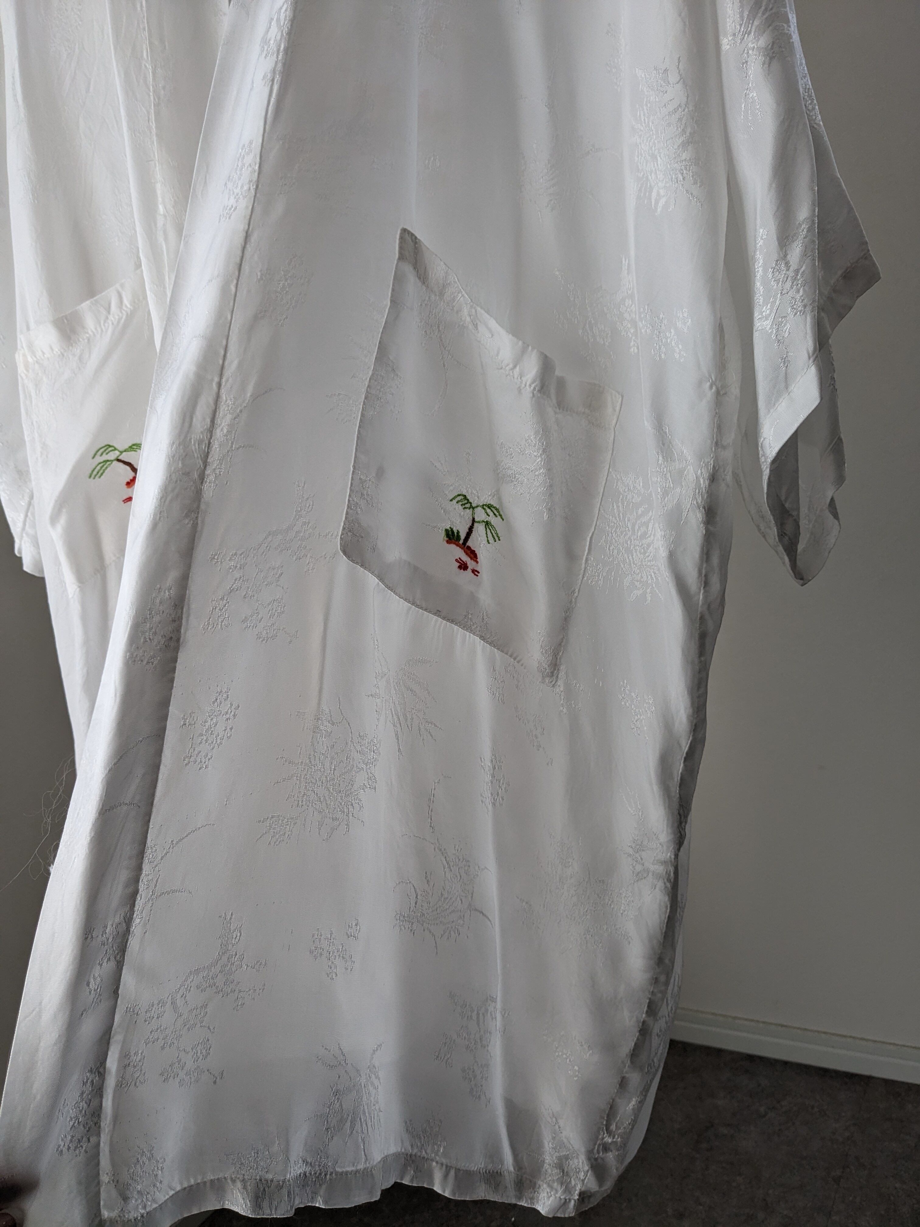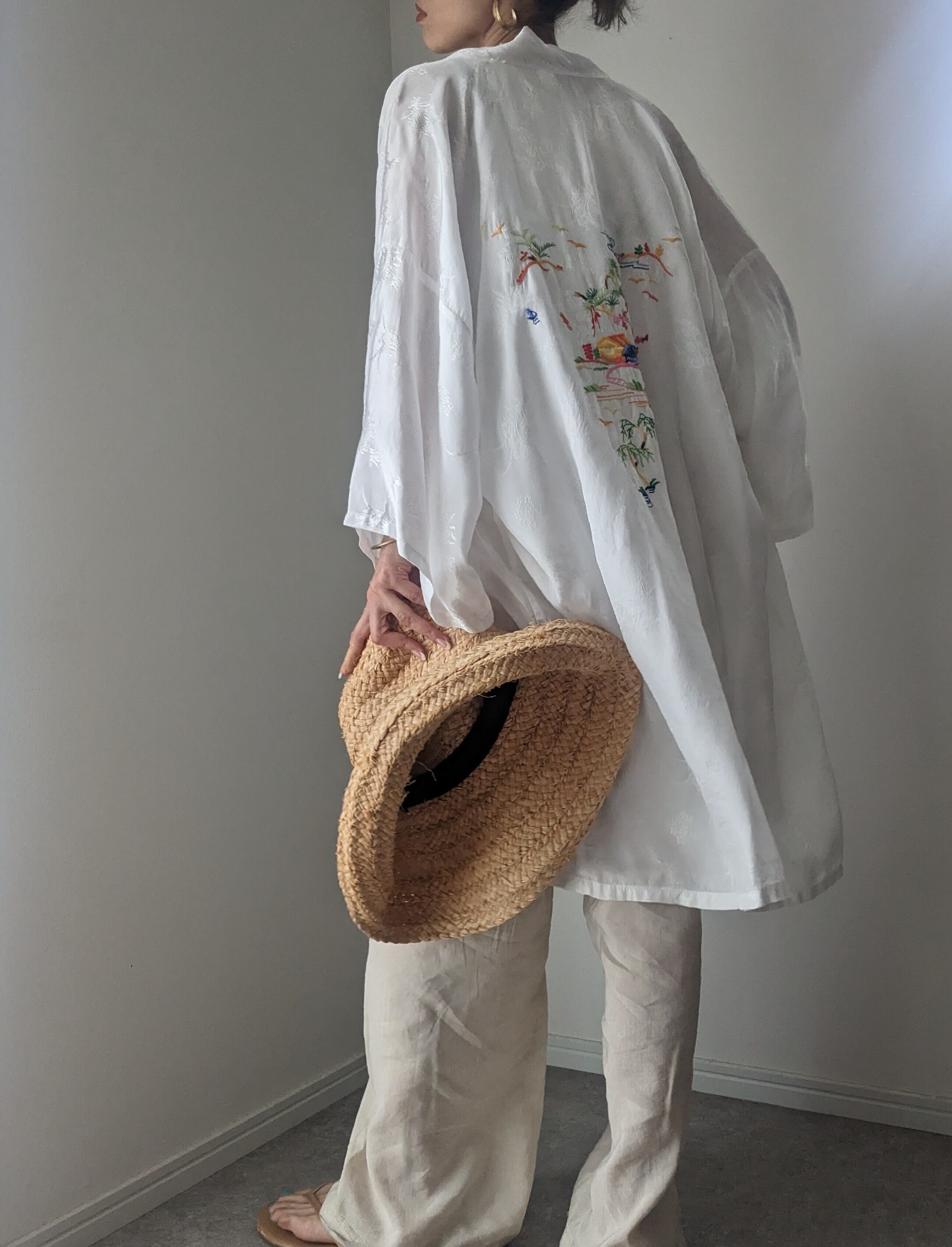 シルクの様な光沢感と、肌触りも良く、テロンとした落ち感のビスコース生地に和柄の型押しで高級感のある雰囲気。真っ白な生地にさらに色鮮やかな刺繍が映えて