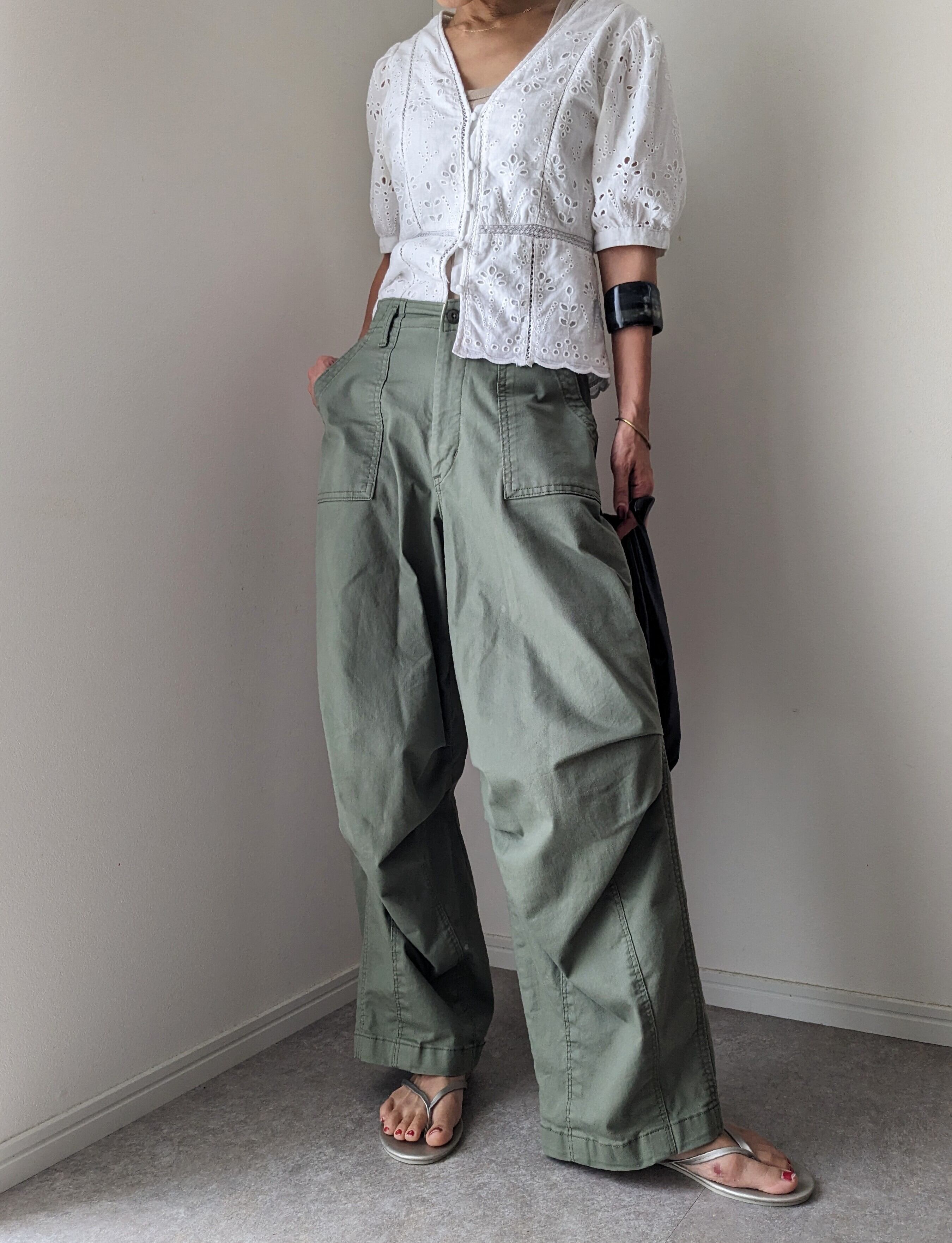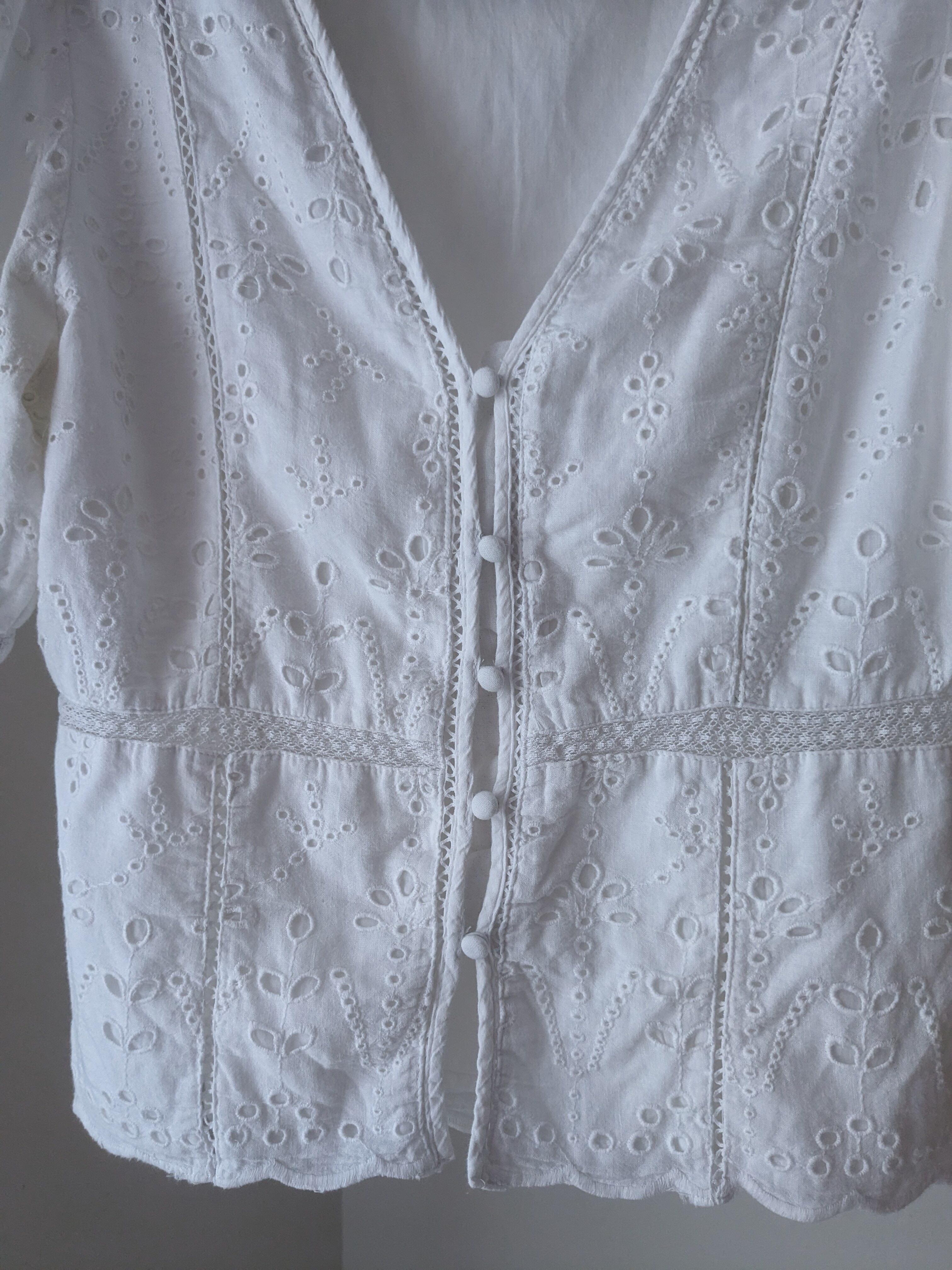 コットンレース素材は、カジュアルで可愛らしい印象です。ウエストにかけてややシェイプされたデザインが身体のラインをキレイに魅せてくれ、あえてボーイズライクなゆるいパンツやデニムとも相性良し。