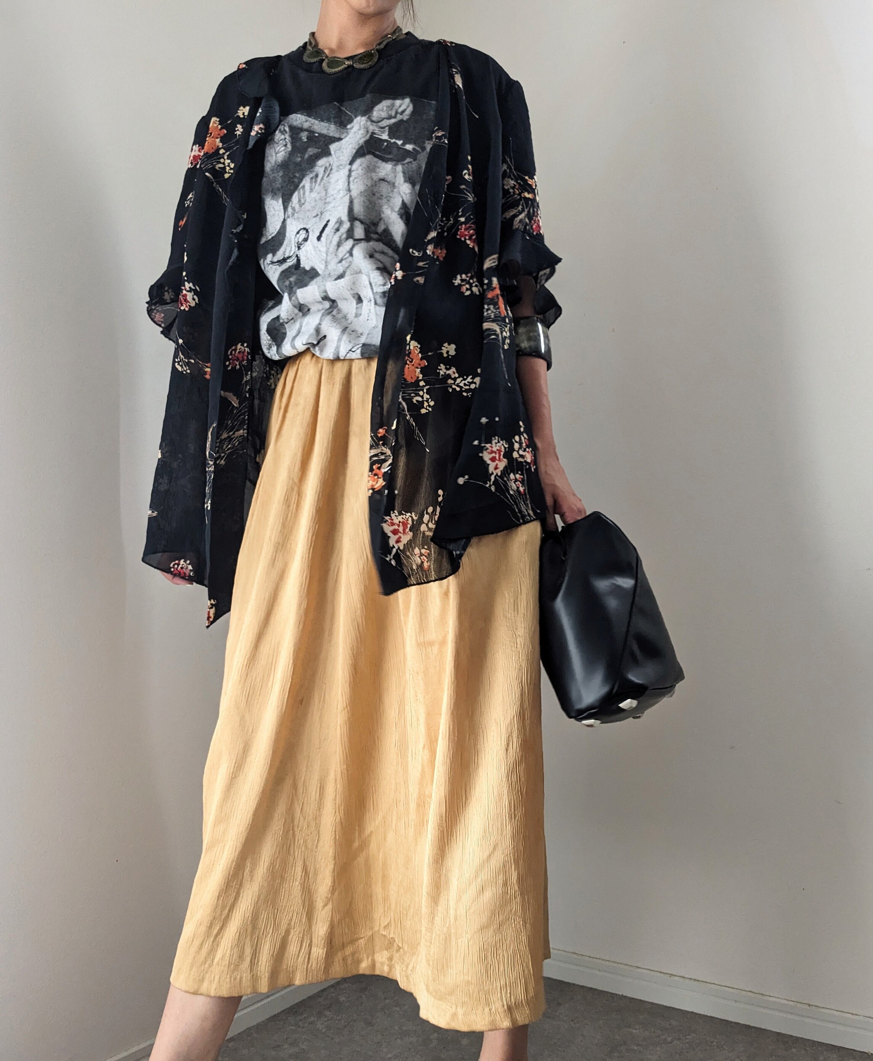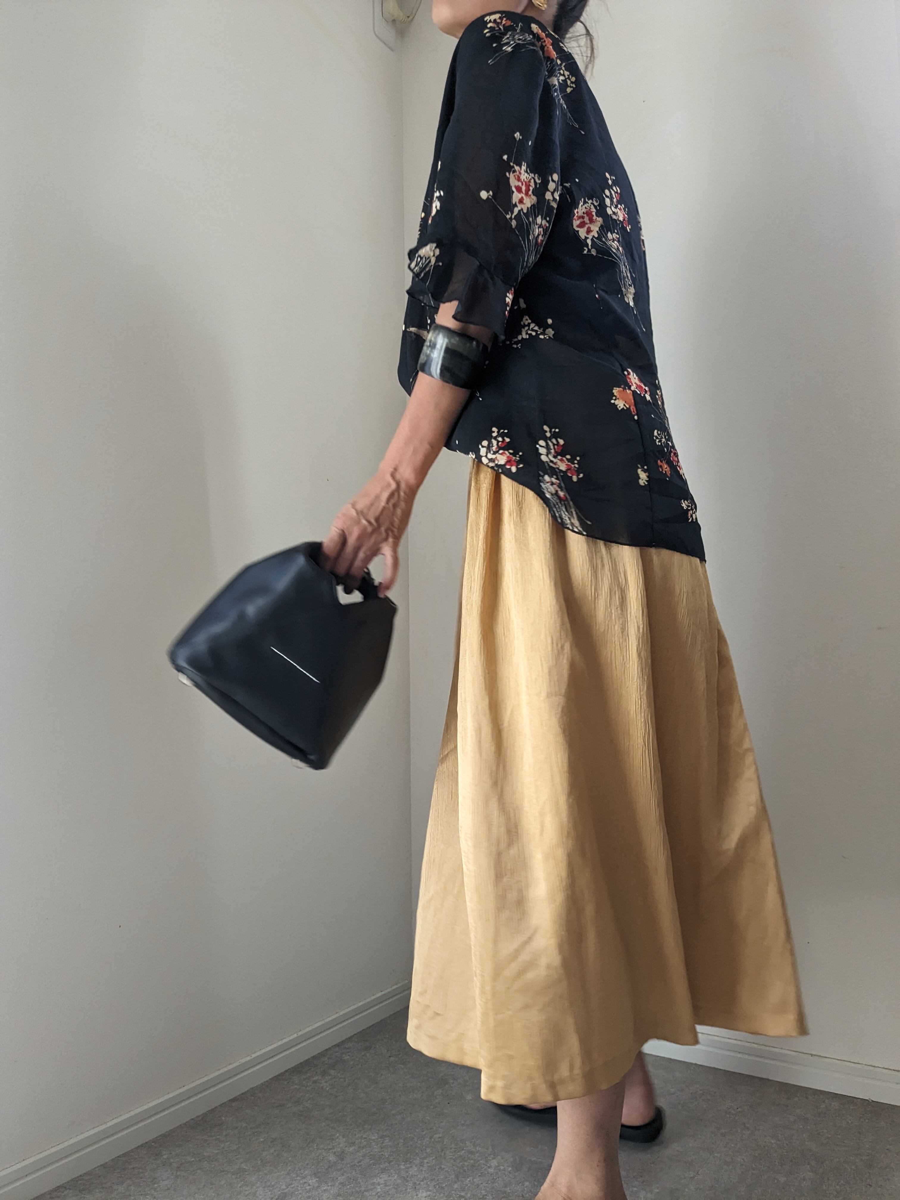 やや透け感のある素材で、この季節、カーディガンのように羽織ってもフロントボタンを留めブラウスのように着用しても素敵です。