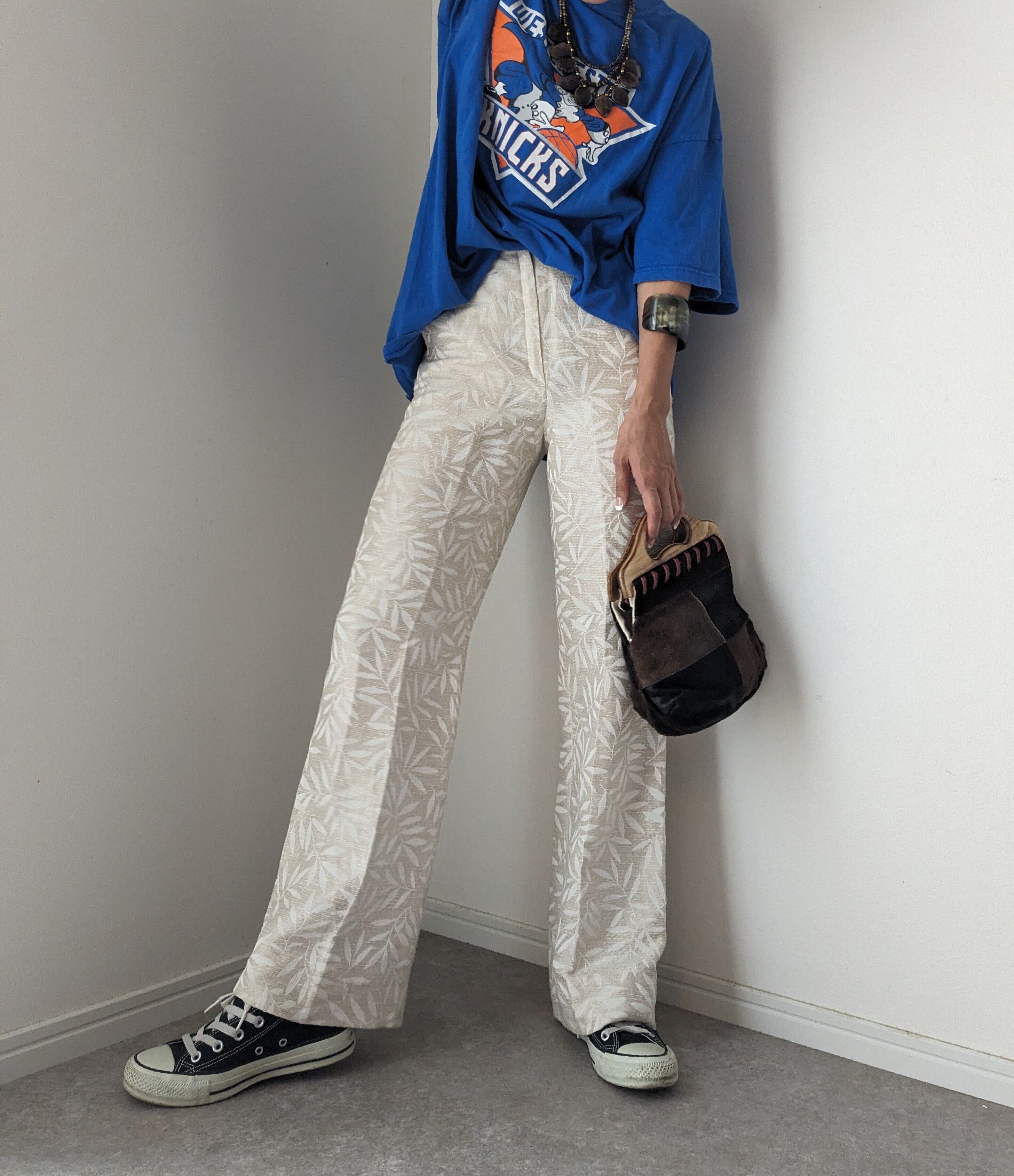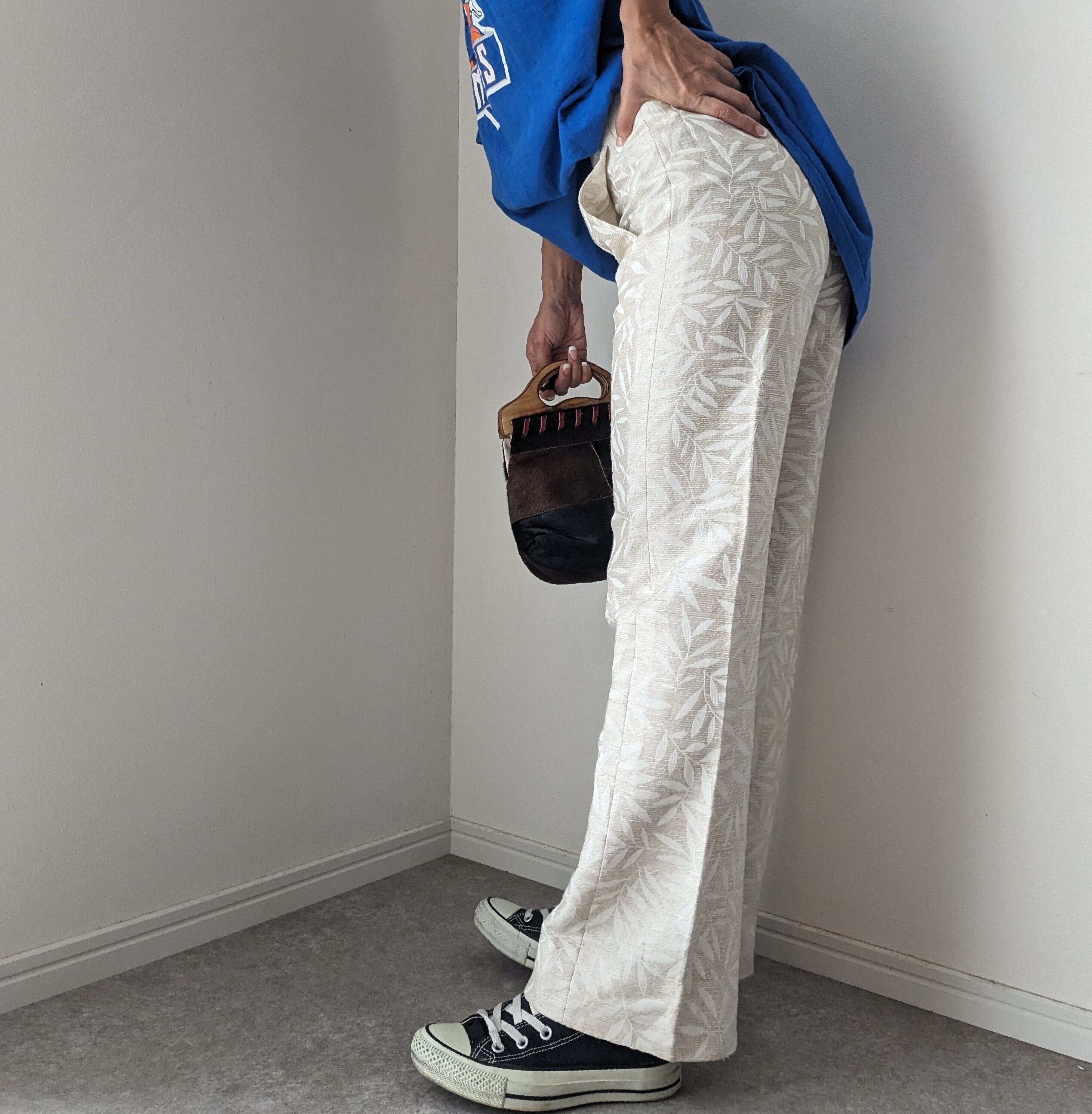 細かく美しいリーフ柄と刺繍の光沢が素敵なストレートパンツです。ストンと落ちる形や、刺繍デザインが大人っぽく、洗練されたシルエット、生地感はフランスのデザイナーにより生産された上質なアイテムです。