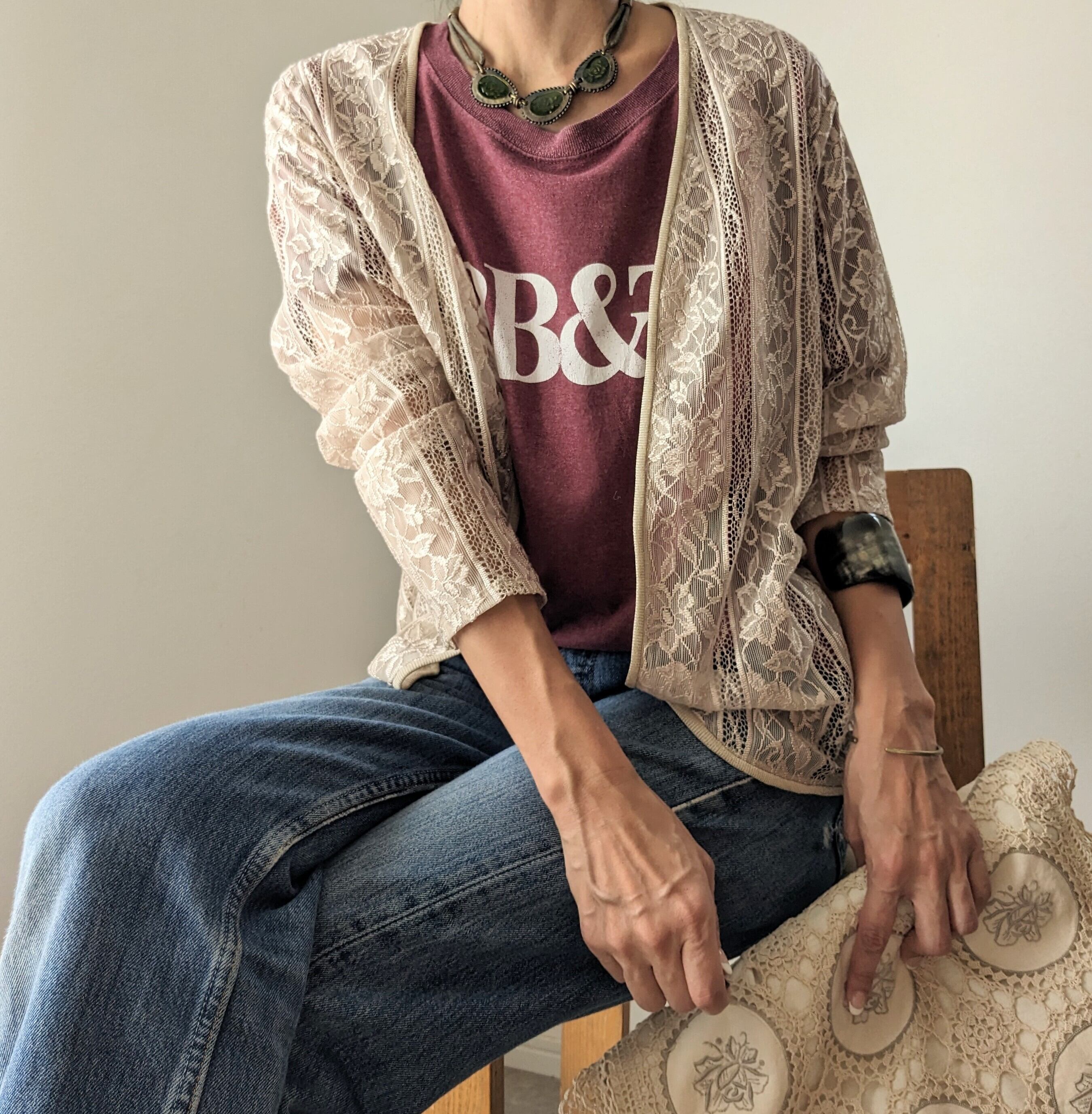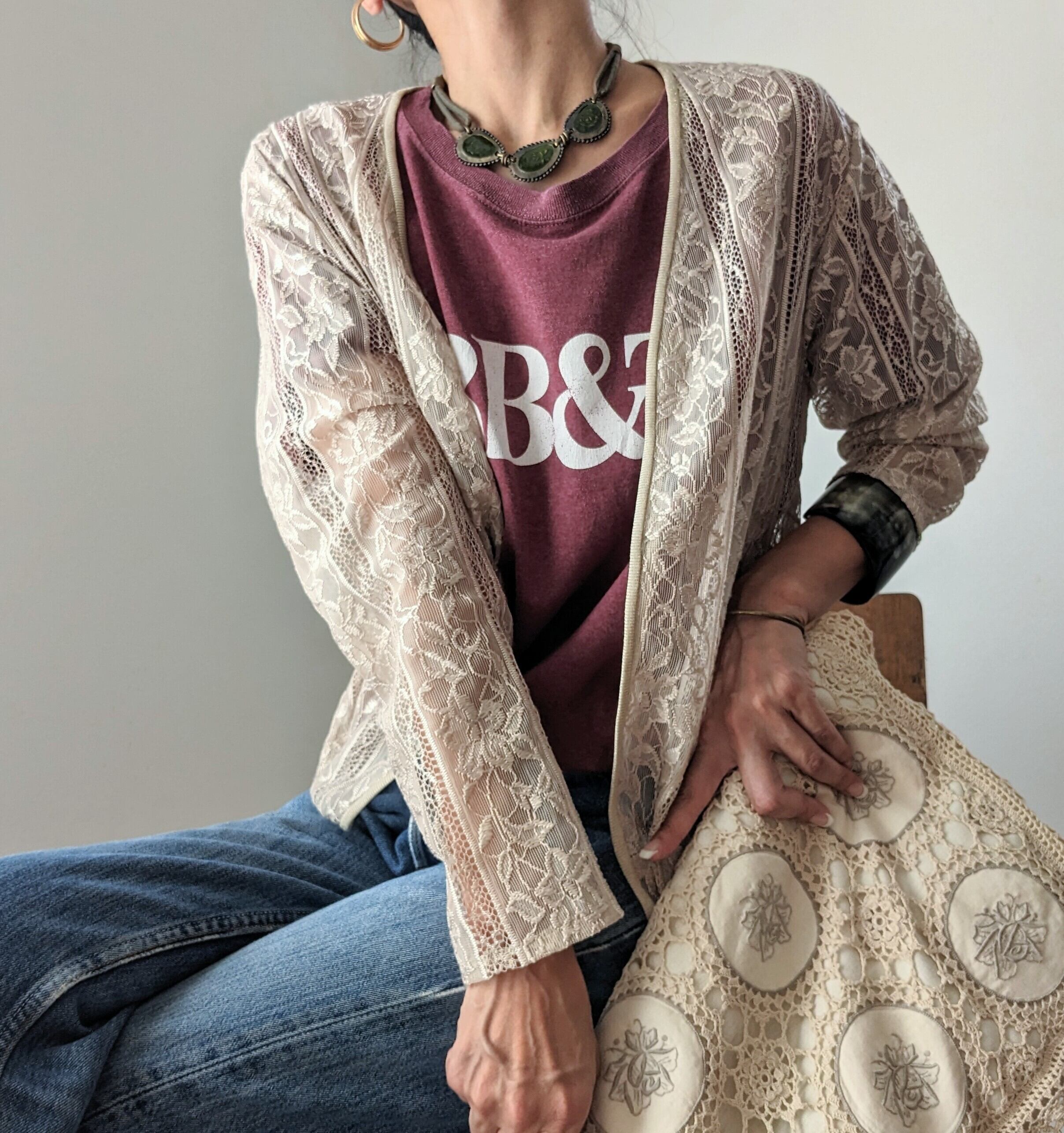 ヴィンテージな雰囲気漂う80-90年代の刺繍レースカーディガン。上品なレース柄と光沢感のあるシャイニー素材が素敵な一枚です。