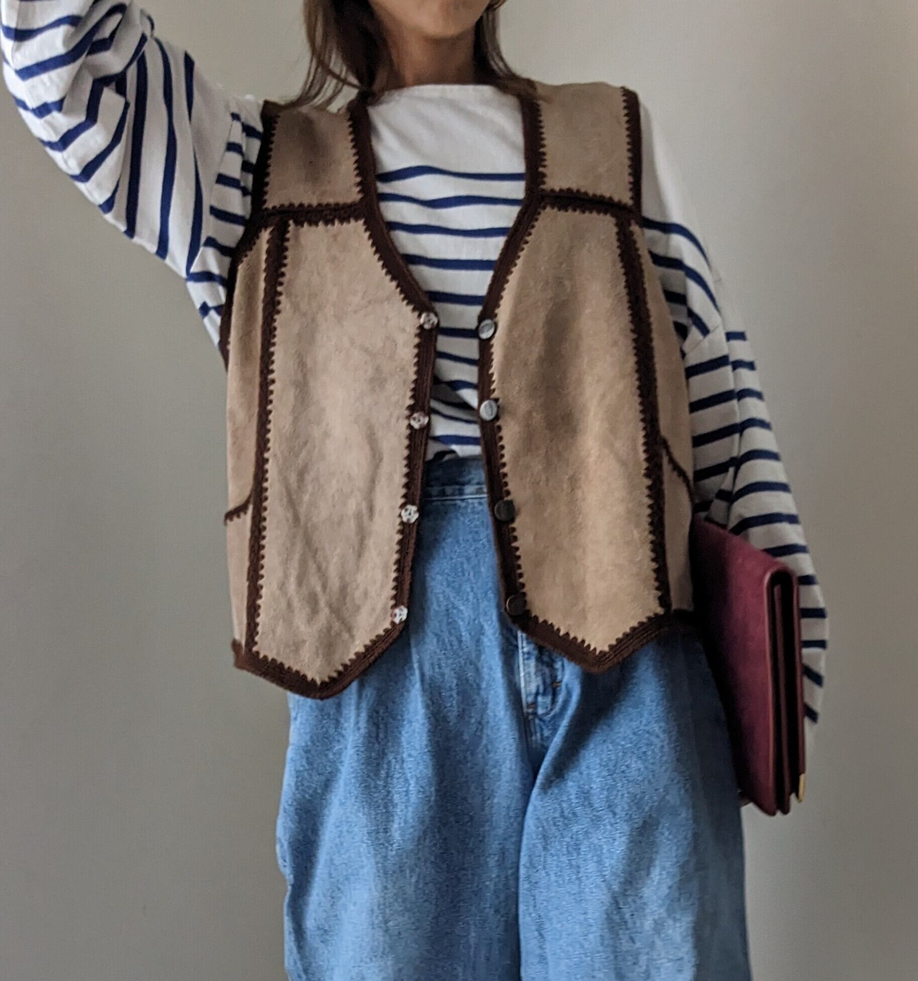 USA embroidery leather best (mocha)は、秋カラーのニット刺繍とリアルレザーを組み合わせたレイヤードスタイルにぴったりのアイテムです。