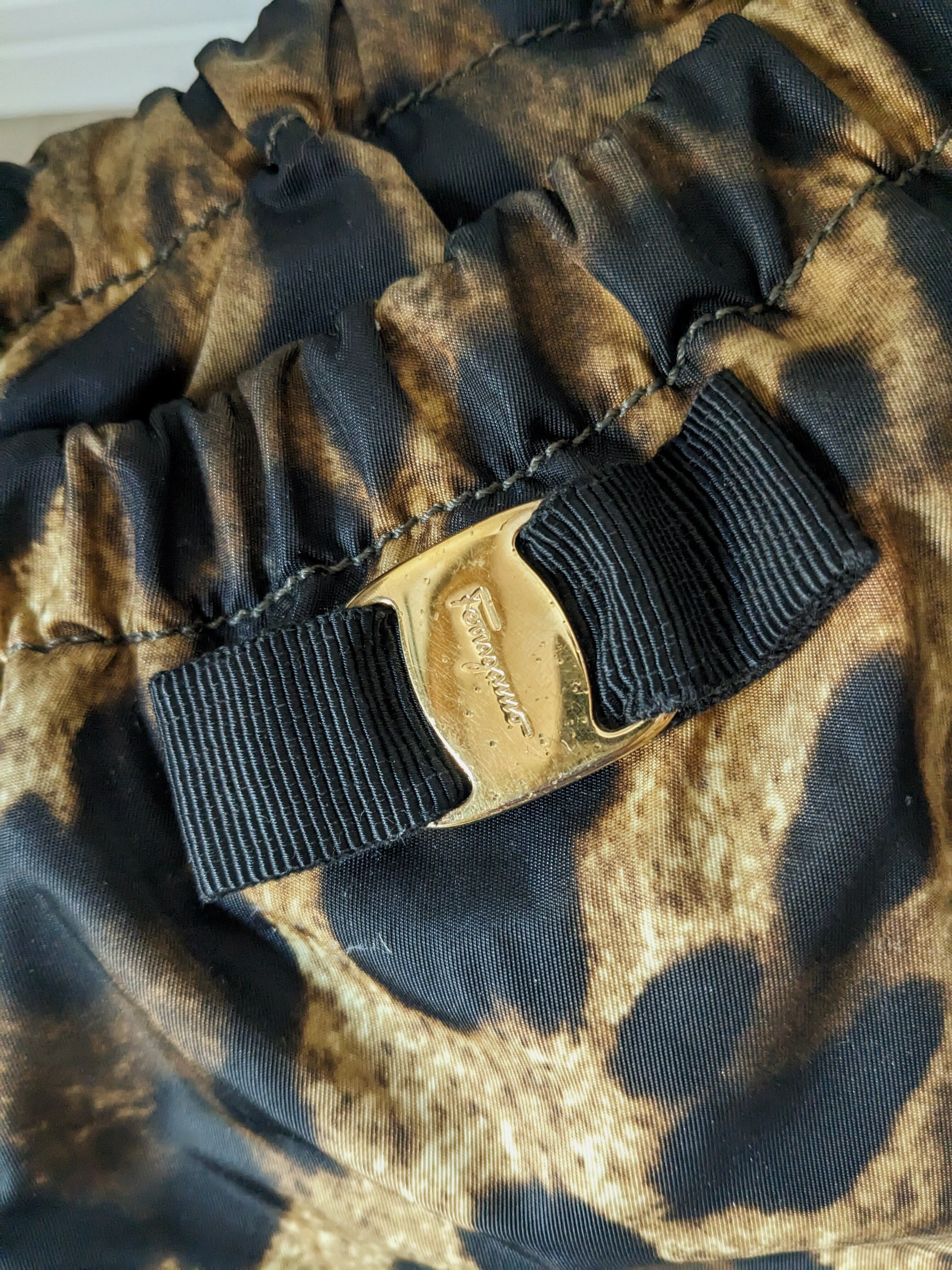 豹柄とブラックカラーの組み合わせが大胆でありながらも上品な印象を与えます。そして、なんといっても容量の広さと機能性の高さが特徴です。内側にはジッパー付きのポケットやスマホポケットなどがあり、小物の整理もしやすくおすすめ!