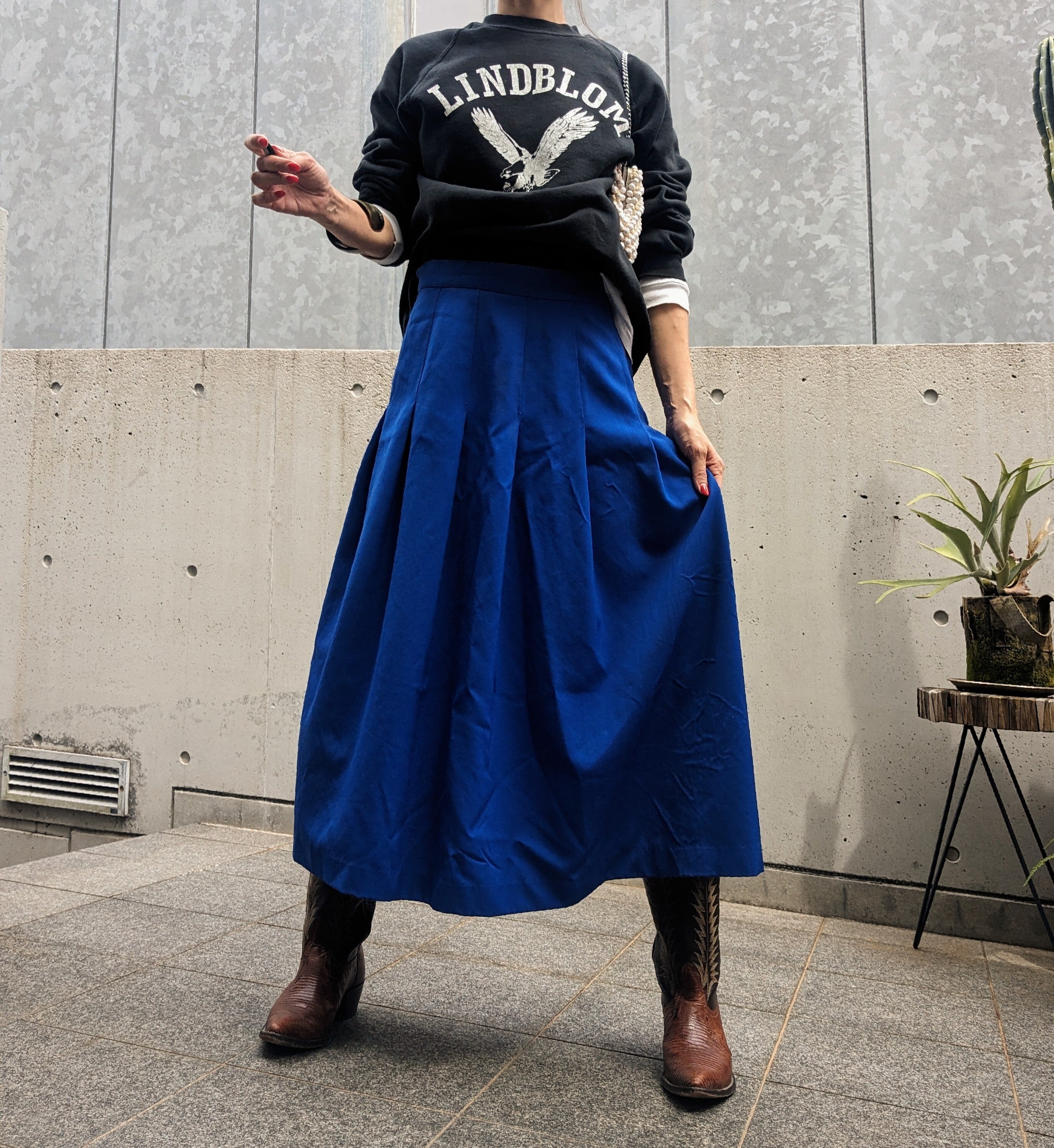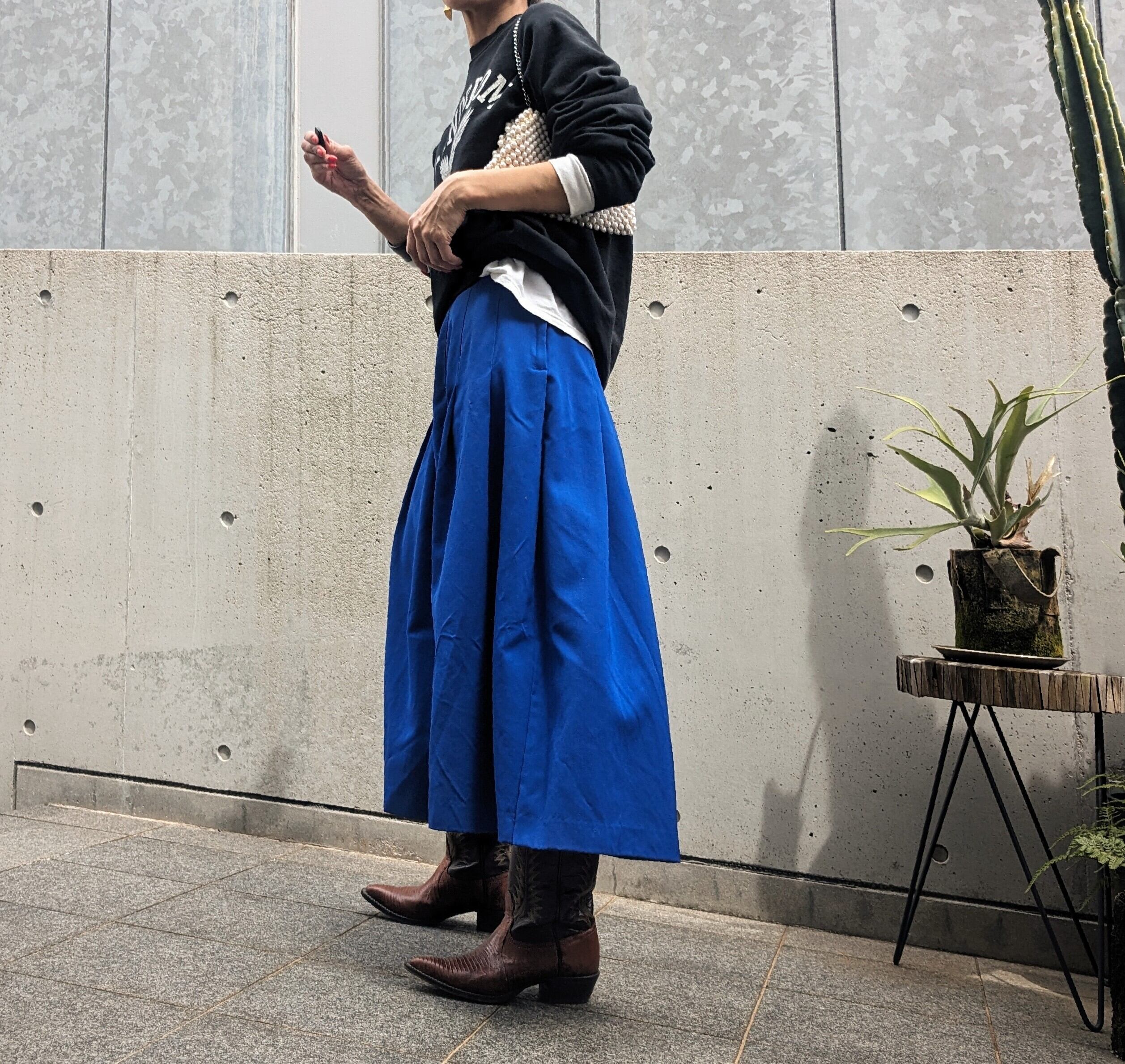パキっとしたbluecolor、サラッとした生地感とタック入りギャザーが特徴のvintage tuck gather skirt。