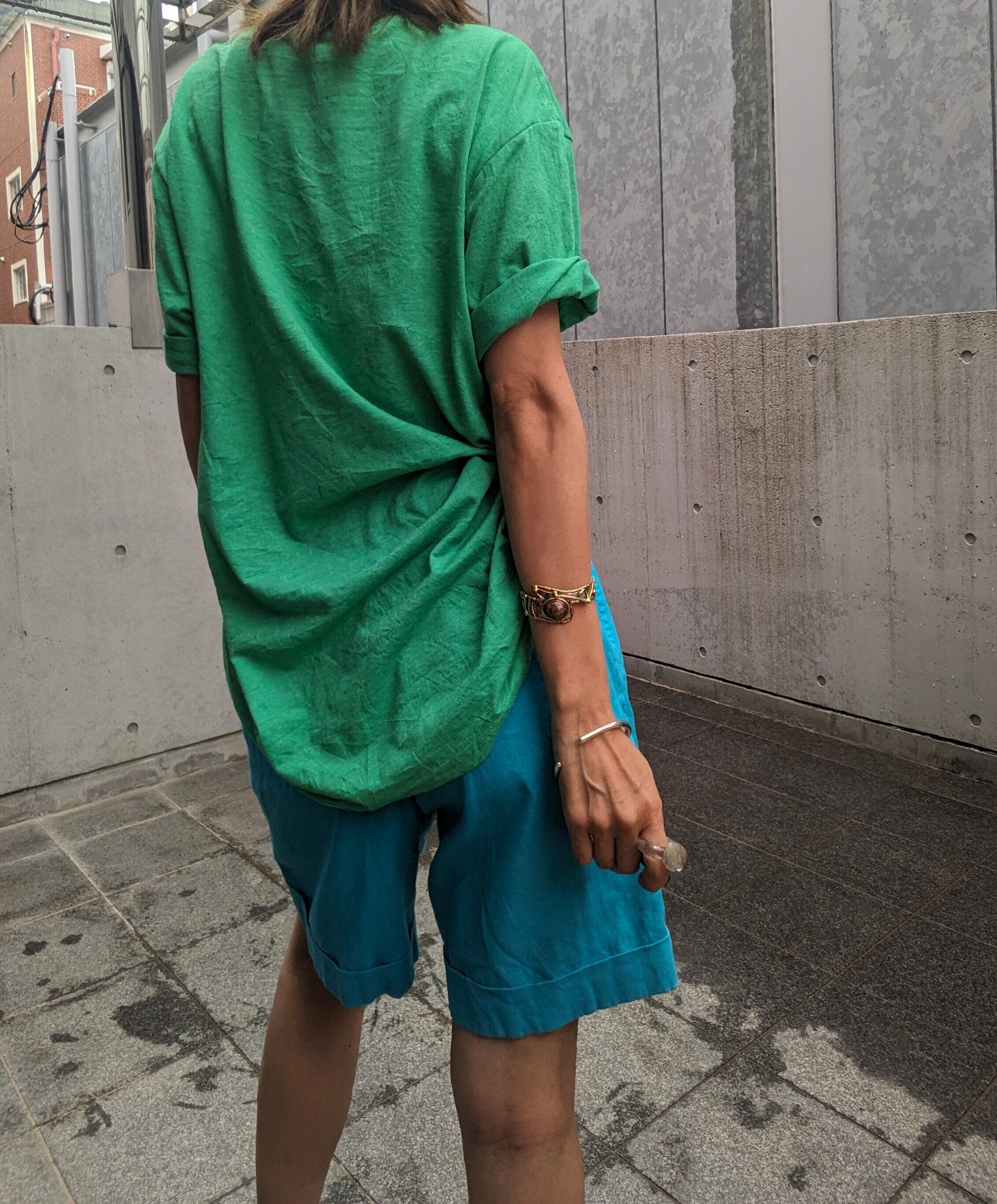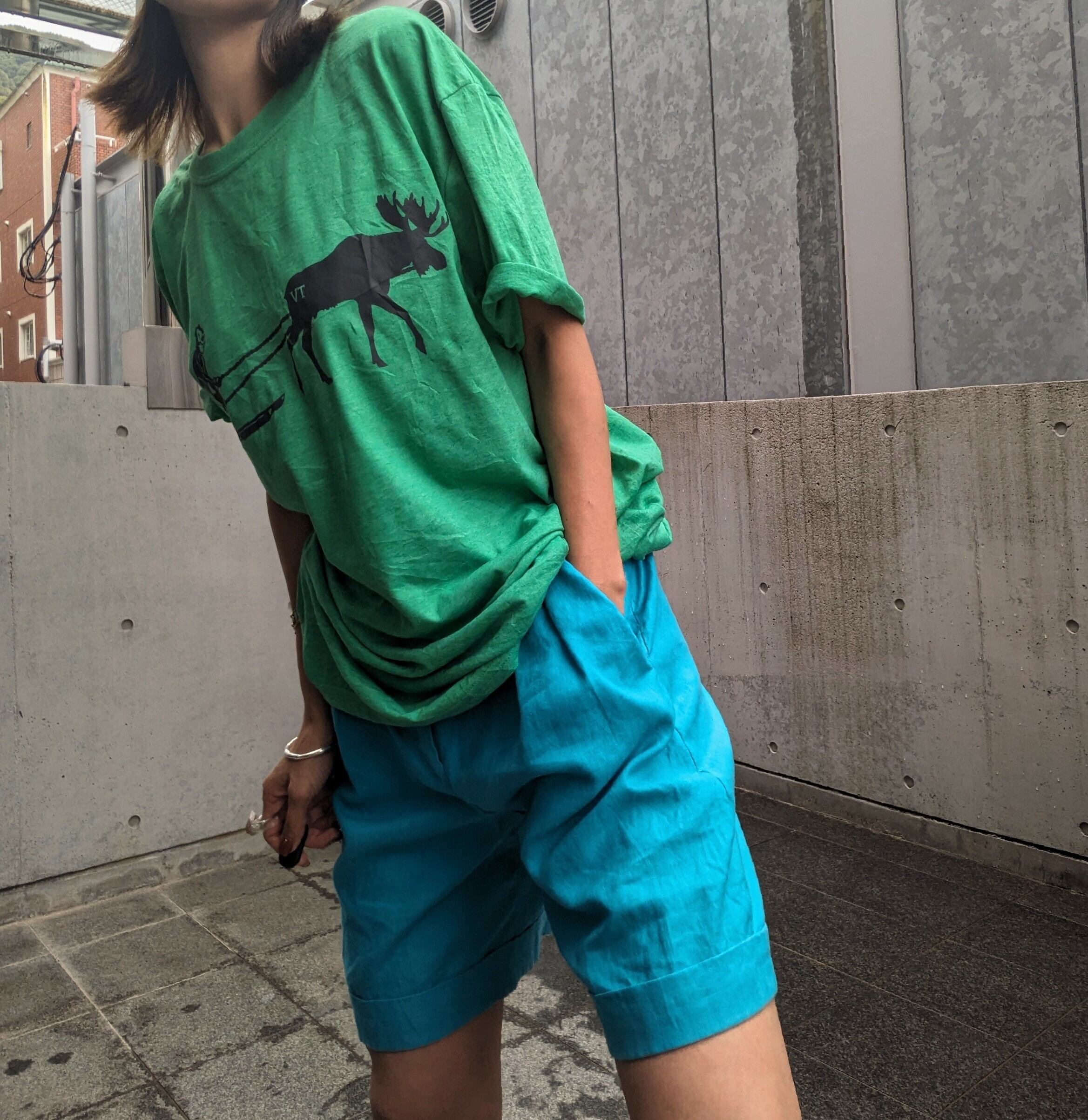明るいエメラルドグリーンカラーが目を引くプリントTシャツです。カジュアルな日常コーディネートにさりげないアクセントにおすすめ。