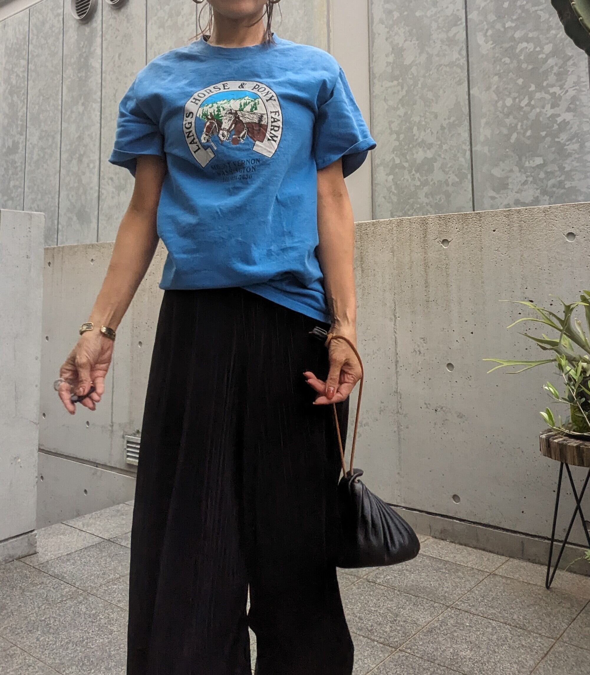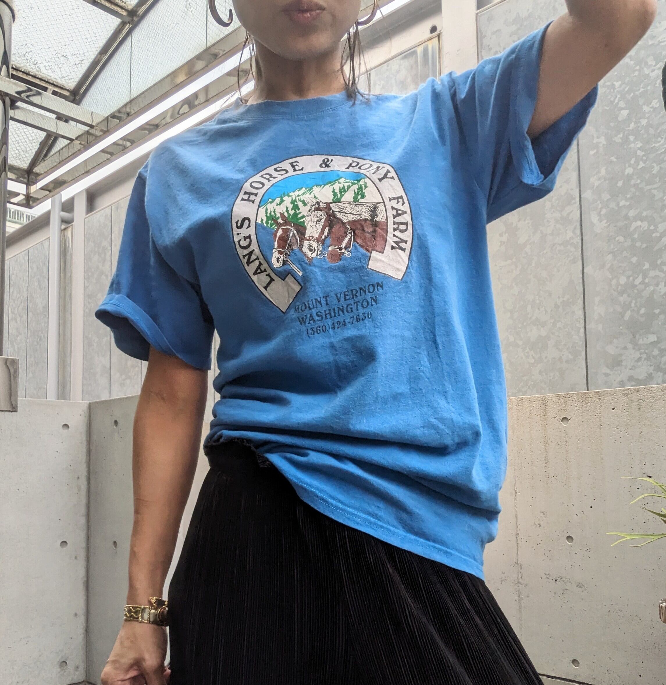 明るいブルーカラーが目を引くUSA vintage horse & pony Tシャツ。USA vintageらしいあるクラシックなプリントと、女性の方に程よいサイズ感が魅力の一枚です。