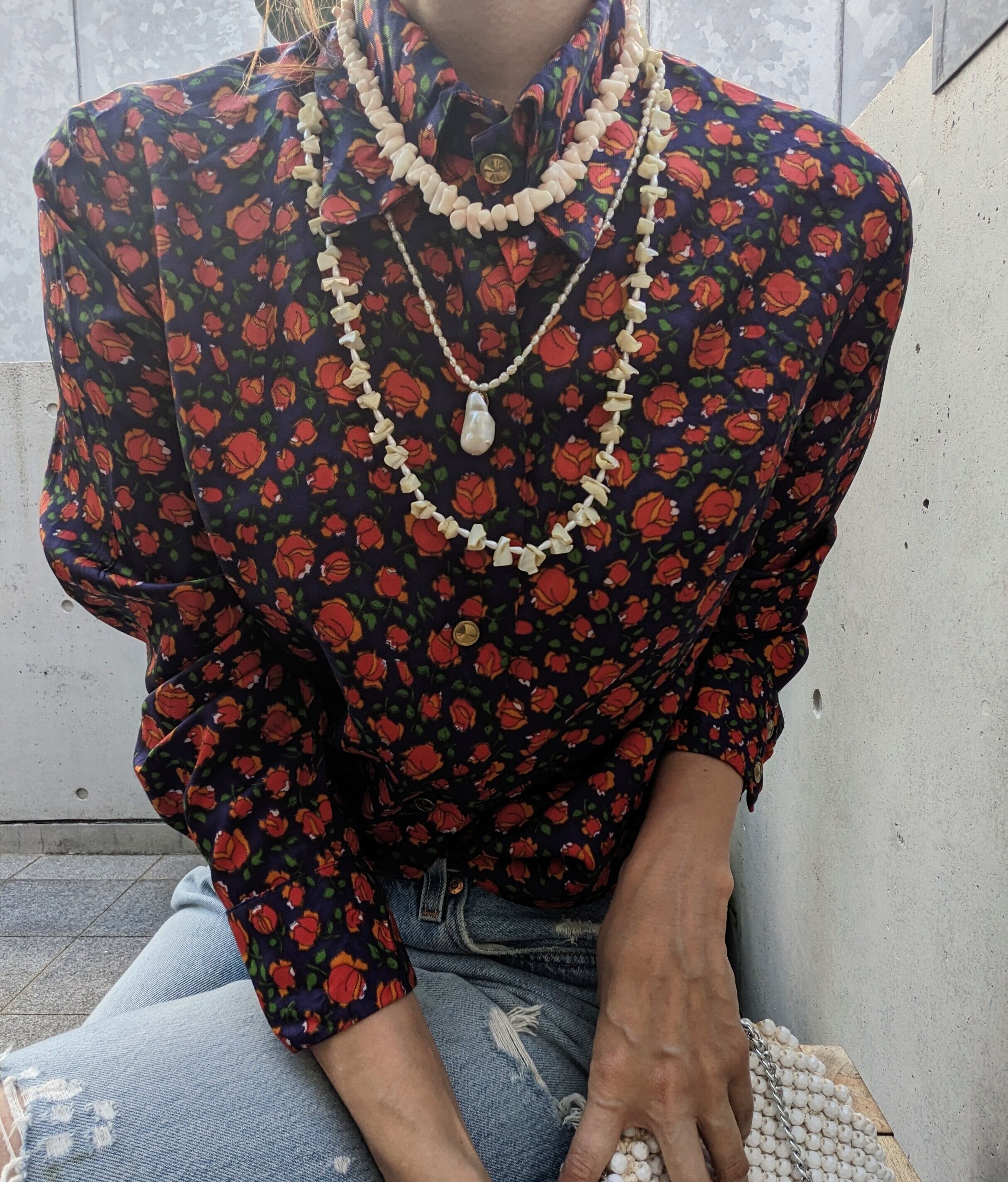 レトロな小花柄とジャストサイズで着用できるサイズ感がかわいらしい一枚です。フロントにはビンテージらしいボタンがアクセントになっており、袖口には程良いギャザーが施され、女性らしいシルエットを演出します。シャープな襟も特徴的で、さりげない個性を演出します。一枚で主役になる存在感を持ちつつ、デニムやワイドパンツなどと合わせてカジュアルにも着こなせます。80年代のヴィンテージを感じさせる素敵な一着です。