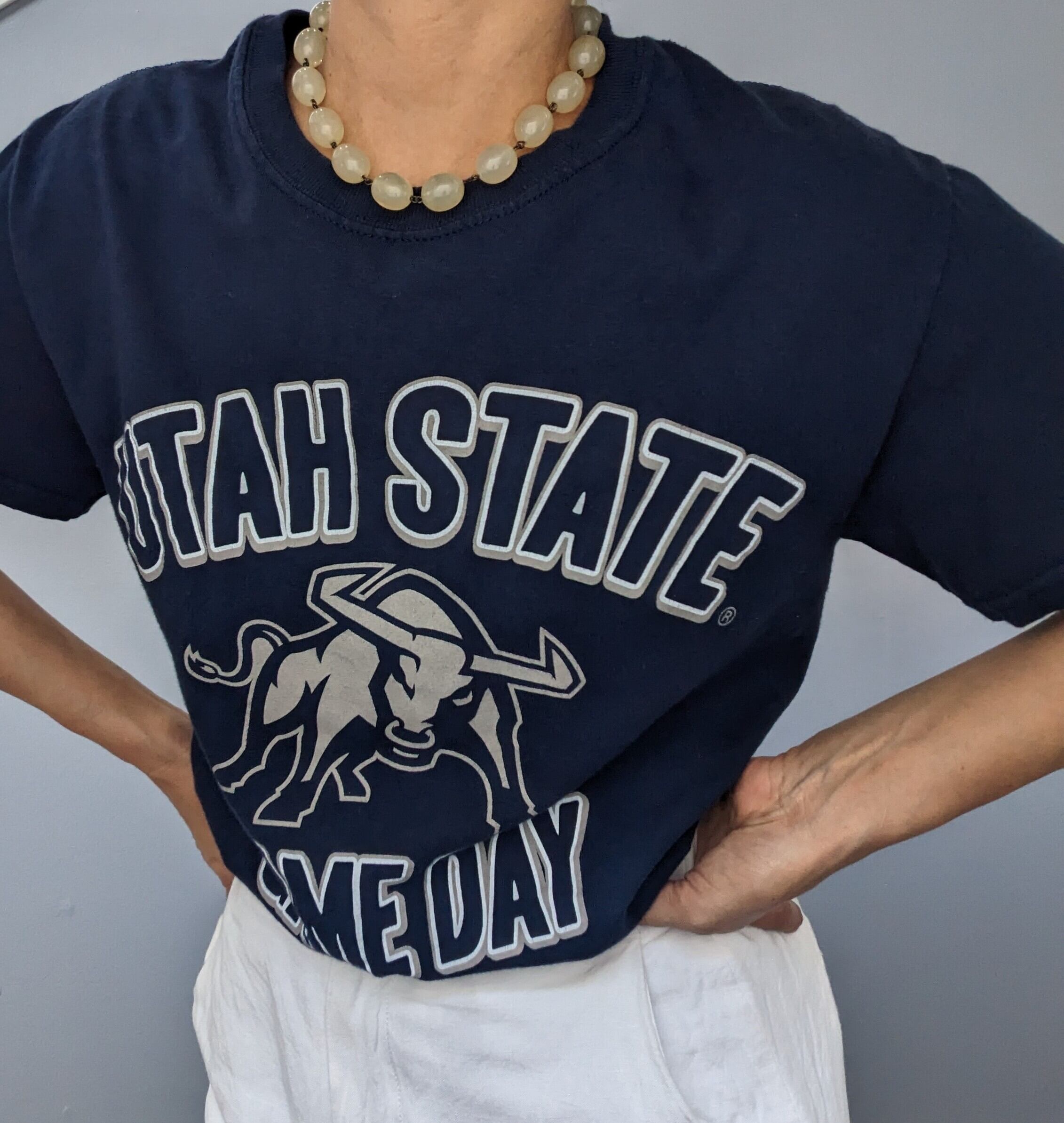 US古着らしいヴィンテージ感漂うデザインは、どんなスタイルにもマッチします。ネイビー×ホワイトのカラーコンビネーションは、落ち着いた印象です。