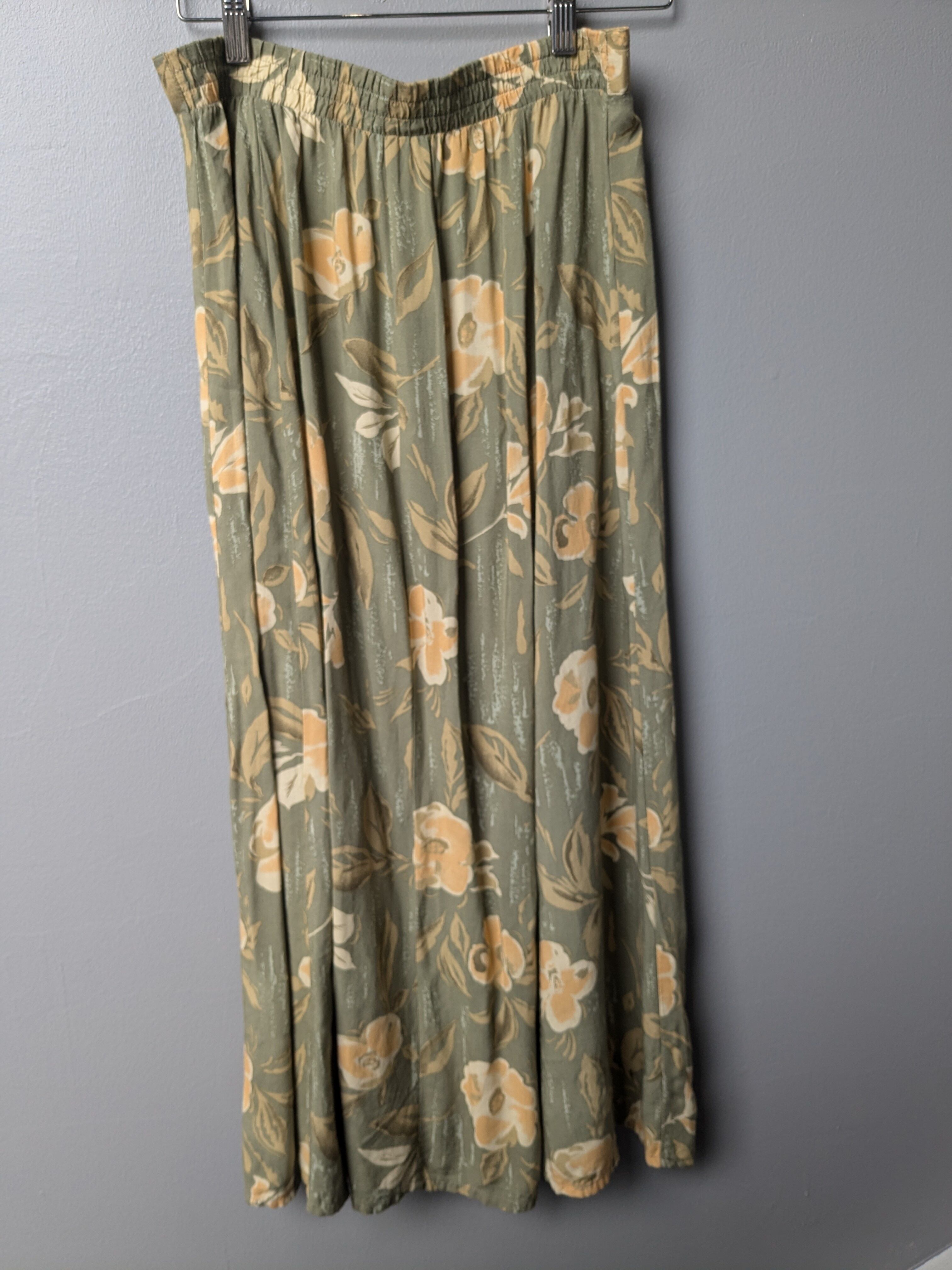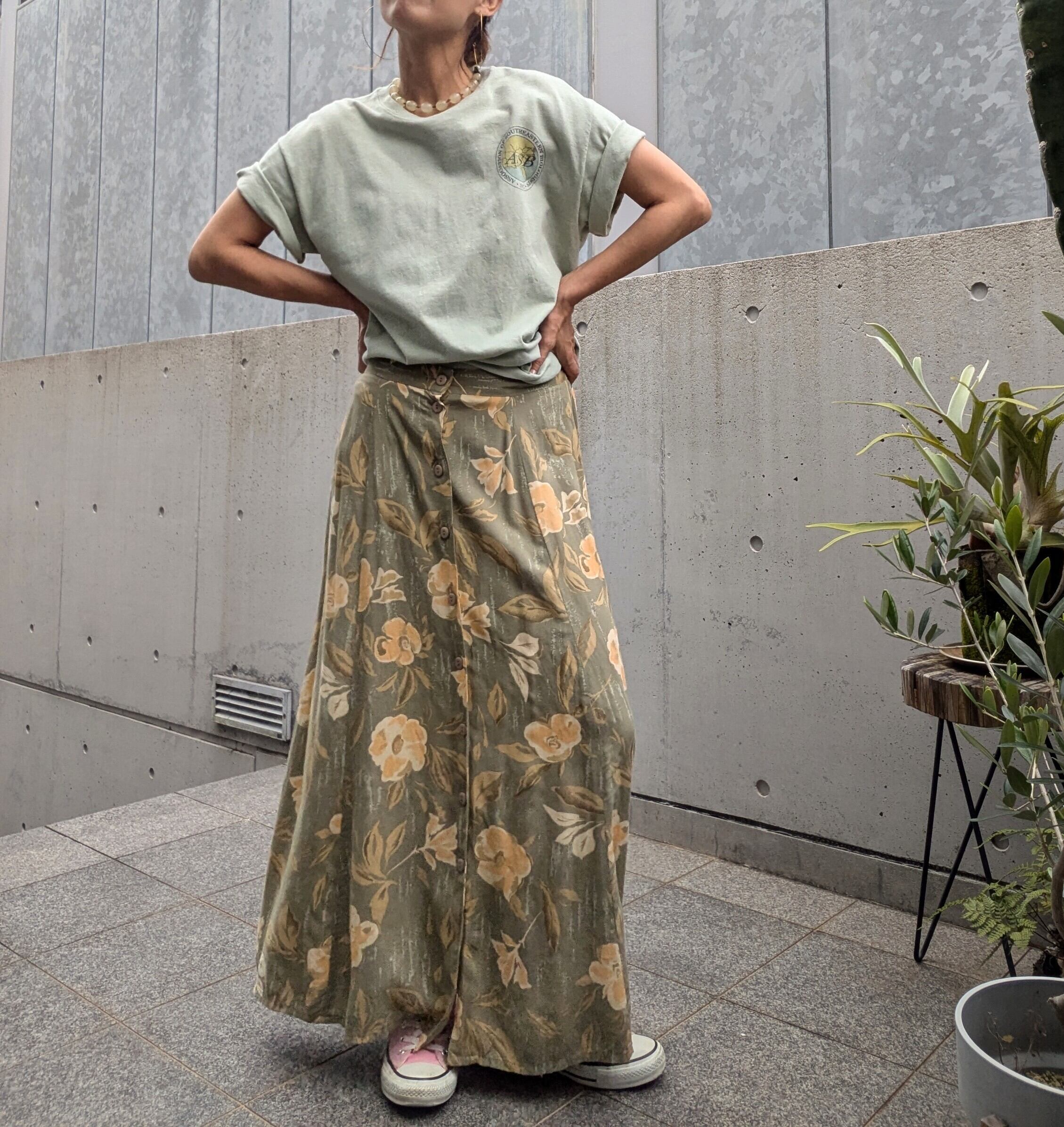 エレガントでフェミニンな印象を演出する一着です。美しいフラワープリントが施されたこのロングスカートは、柔らかなレーヨン素材で作られているため、快適な着心地です。フレアなシルエットが女性らしさを引き立ててくれます。