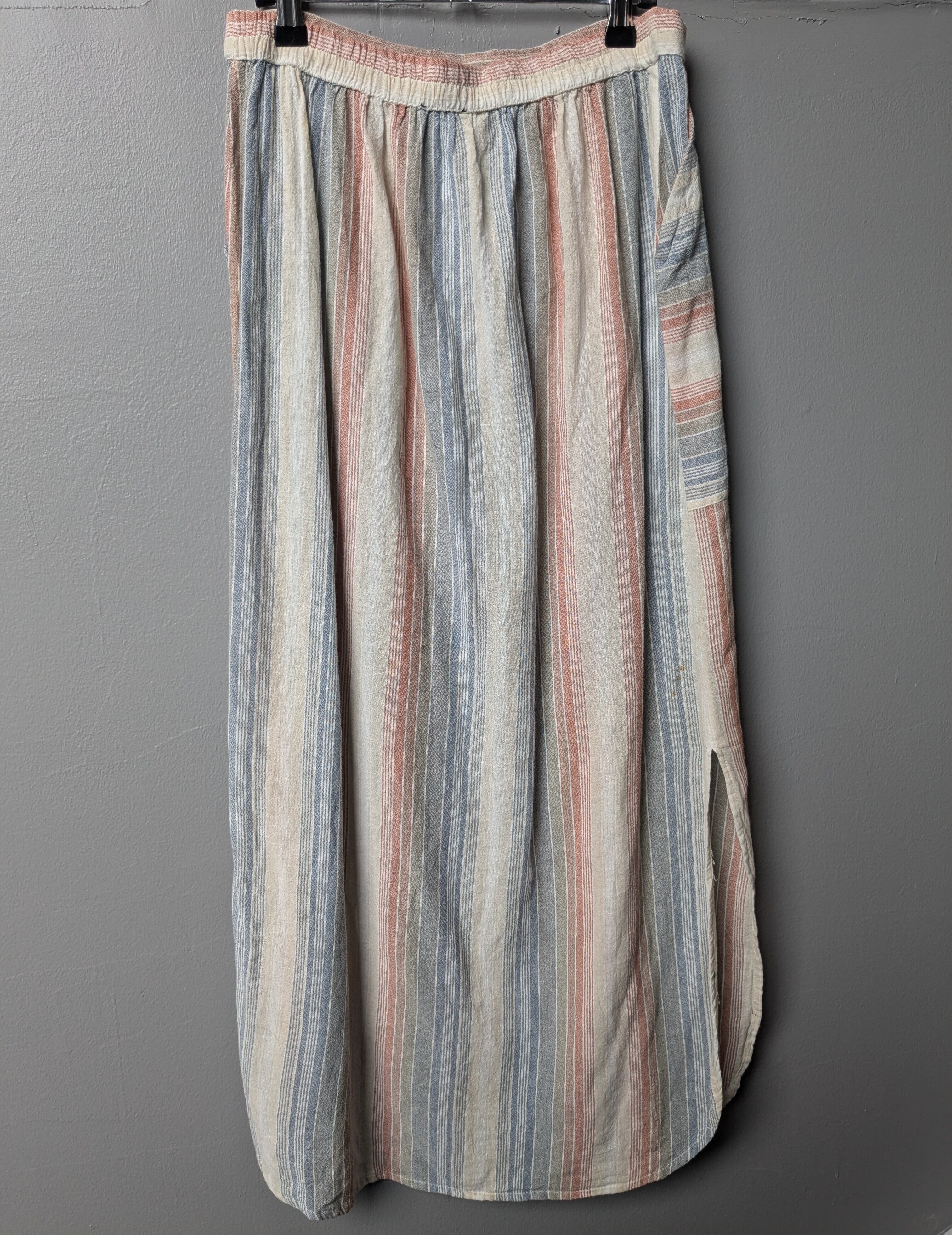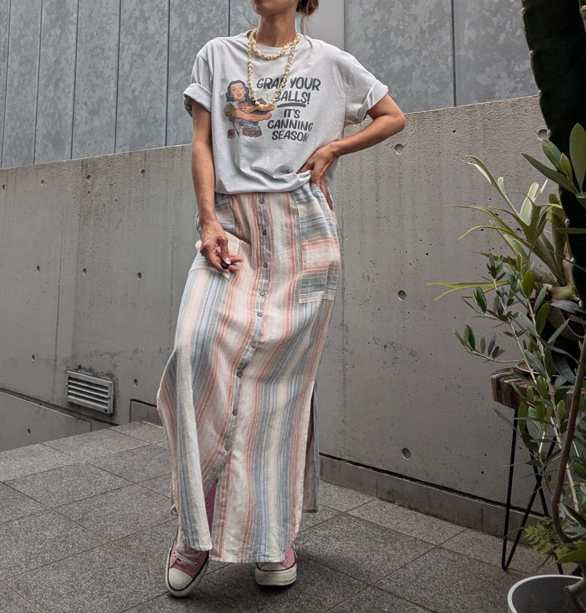 涼しげで涼やかなインドコットン100%で仕立てられたこのロングスカートは、ストライプ柄が涼しげな印象です。夏の季節にぴったりの一枚