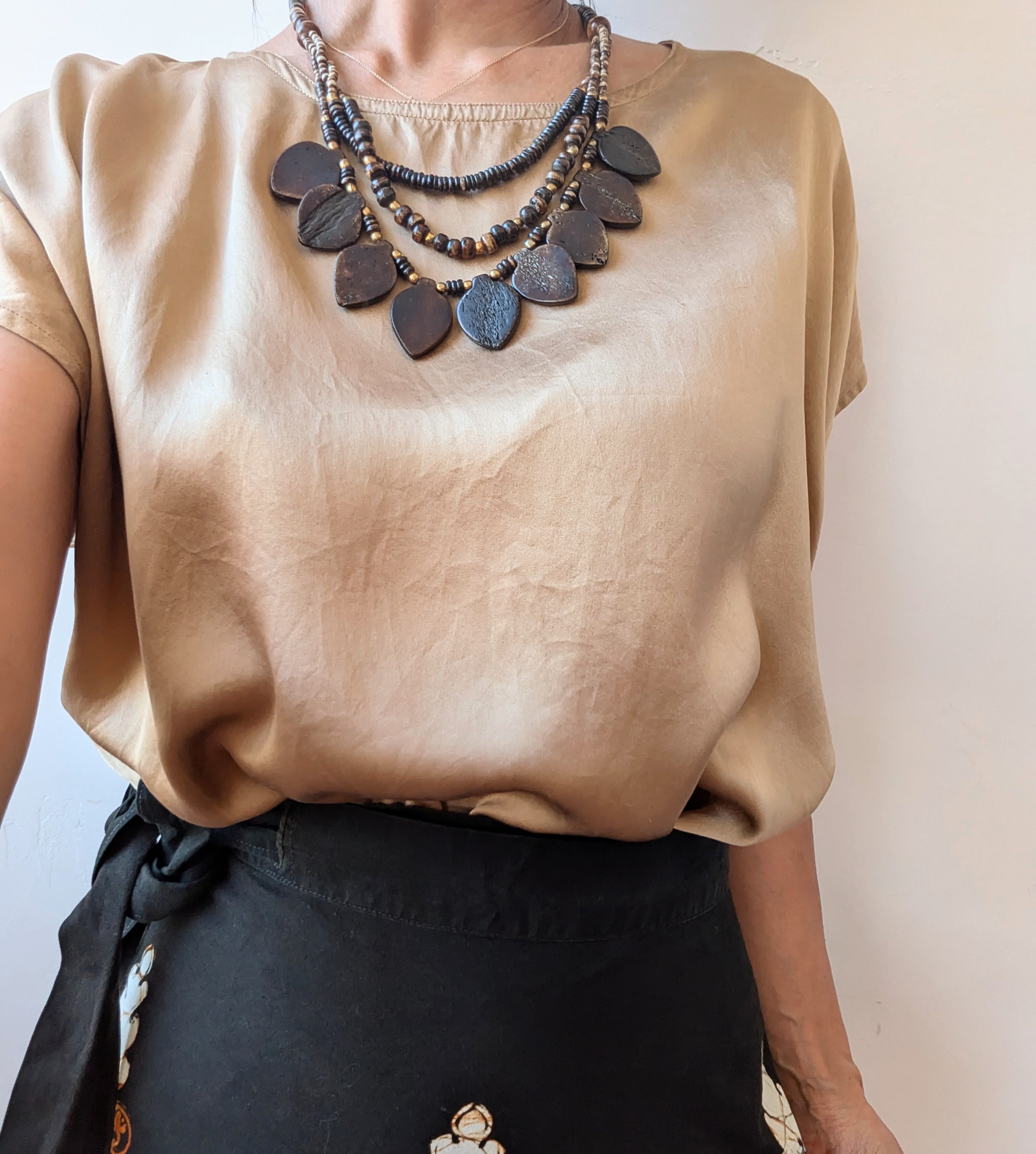 シルク100%で作られた光沢が魅力的なフレンチスリーブブラウス。上品でセクシーな雰囲気を演出し、大人の女性にぴったりの一枚です。シンプルながら、ゴールドの光沢と袖のフレンチスリーブデザインが腕周りをすっきりと見せてくれ、大人っぽく華奢見えする1枚です。