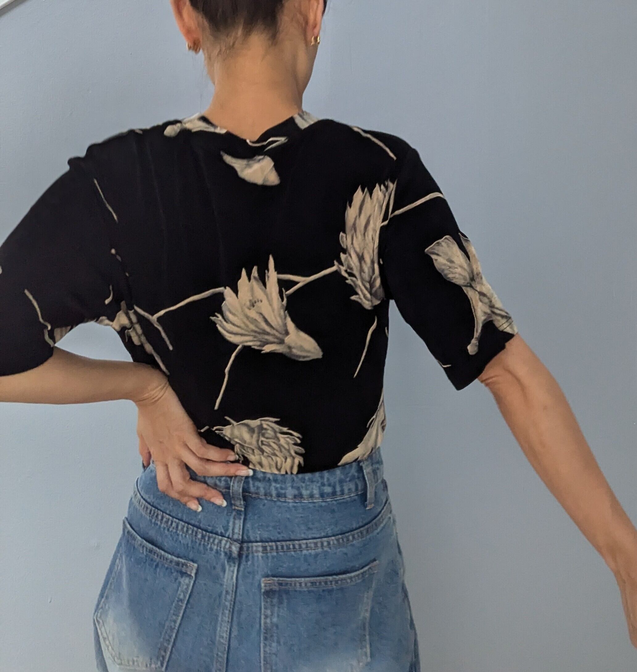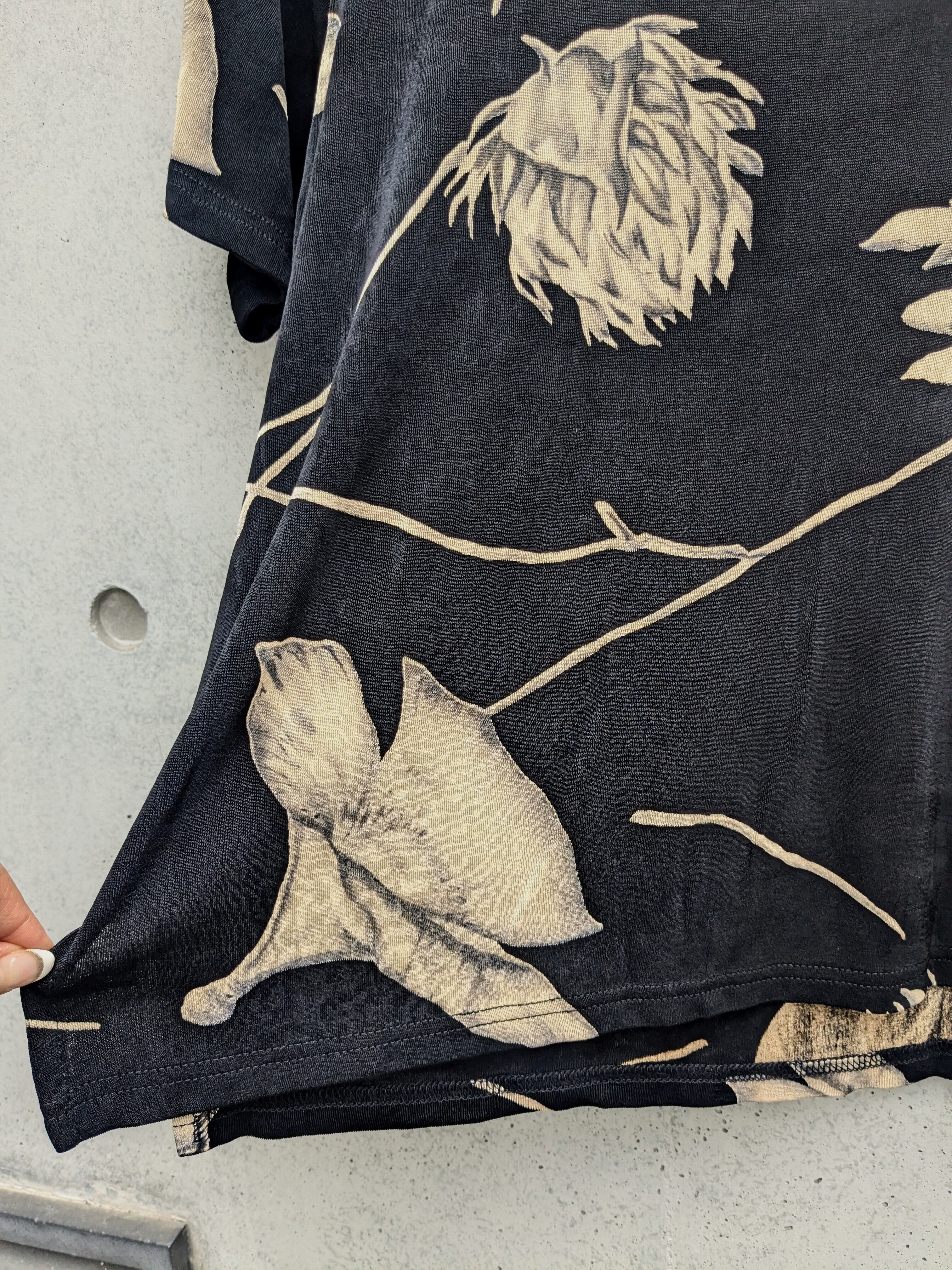 モノトーンカラーの大柄の花柄が、シンプルながらも存在感を放ちます。リゾート感のある雰囲気で着るだけでコーディネートがぐっと華やかになる一着です。トレンドの大柄柄を取り入れつつも、大人っぽさを忘れないデザインが魅力的です。