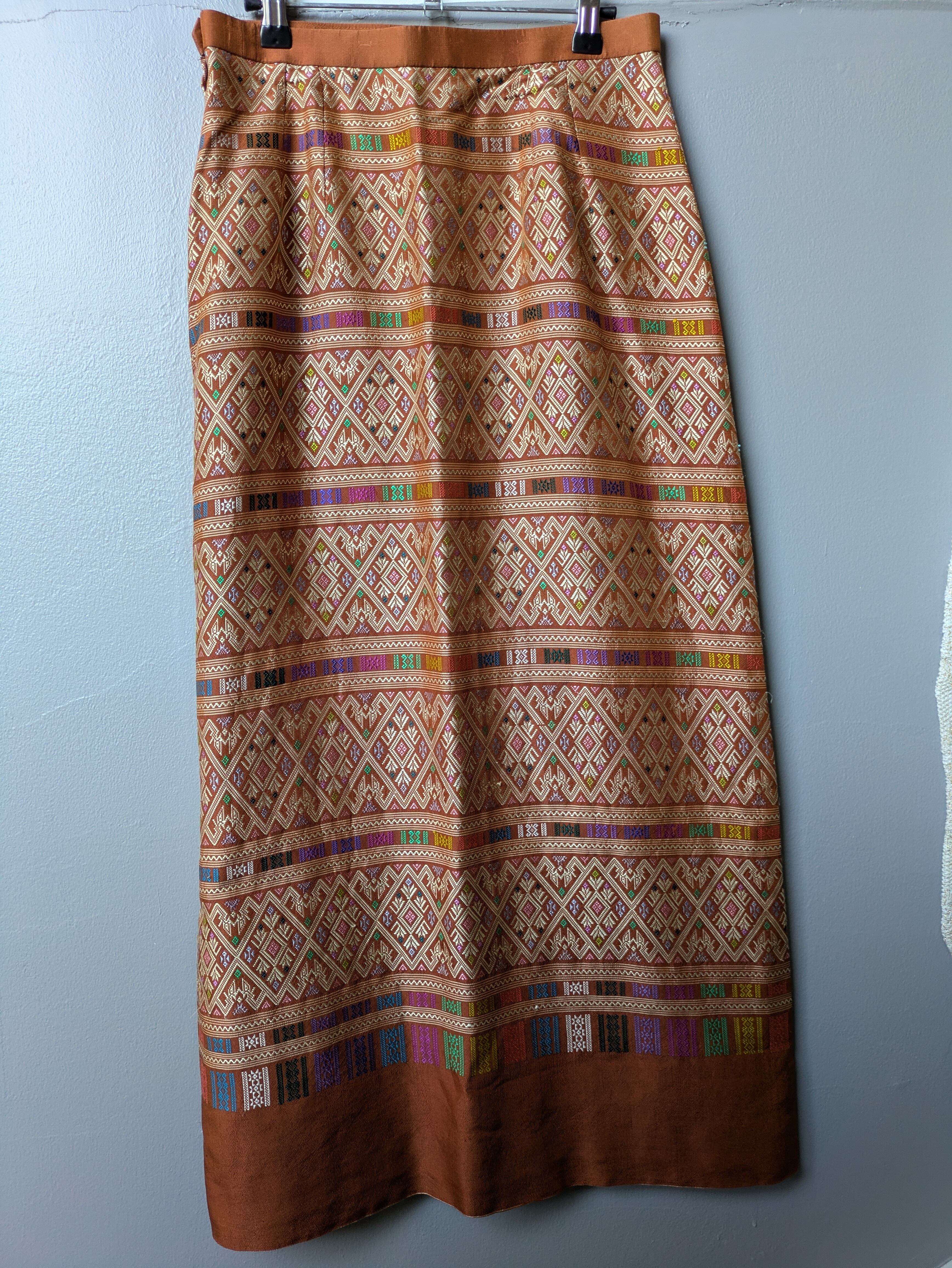 華やかなシルク刺繍が施されたエスニックスタイルのロングスカート。しなやかで軽やかなシルク素材が、優雅な動きを演出し、特別な日のお出かけにもぴったりです。多彩な色使いと独自のデザインが魅力で、シンプルなトップスと合わせるだけで、一気に印象的なコーディネートが完成します。他にはない、刺繍が美しいロングスカートです。