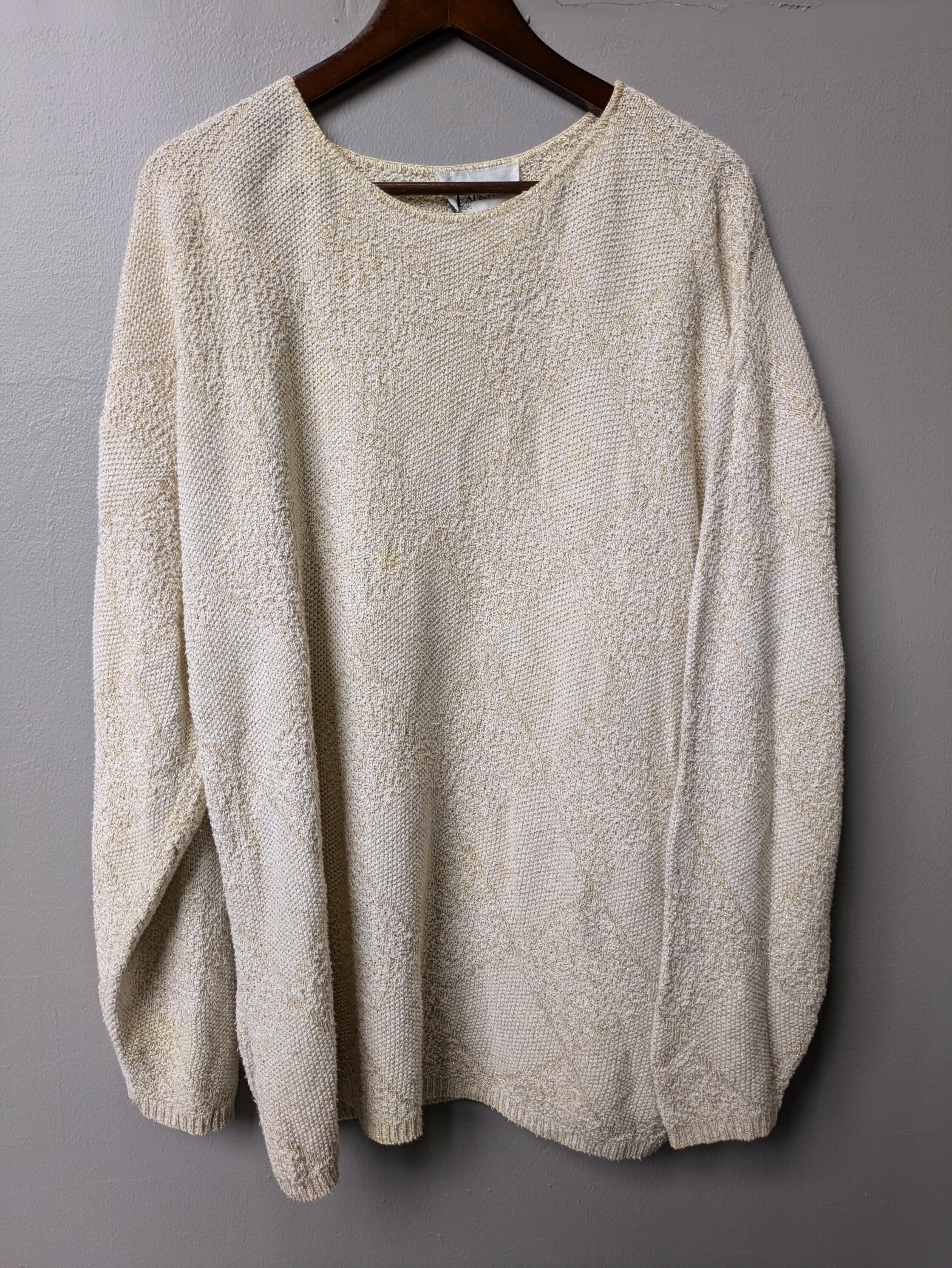 オーバーサイズコットンラメニットプルオーバーです。リラックス感のあるざっくりとしたルーズなシルエットにラメ素材の煌めきが華やかで、さらっとしていてスウェット感覚で着用できるコットンニットです。大判のダイヤ柄がカジュアルながらもすっきりと大人っぽい雰囲気に仕上げてくれます