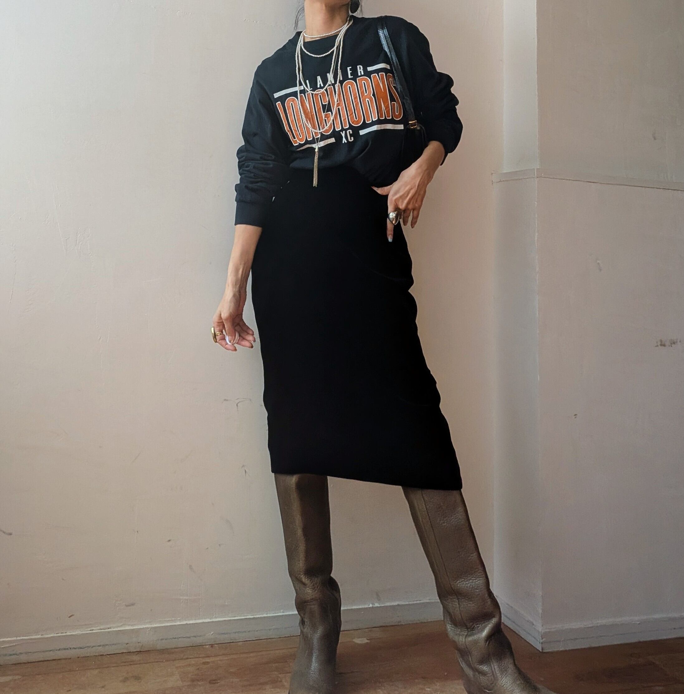 上品な光沢が魅力のハイウエストベルベットミモレ丈ペンシルスカートです。