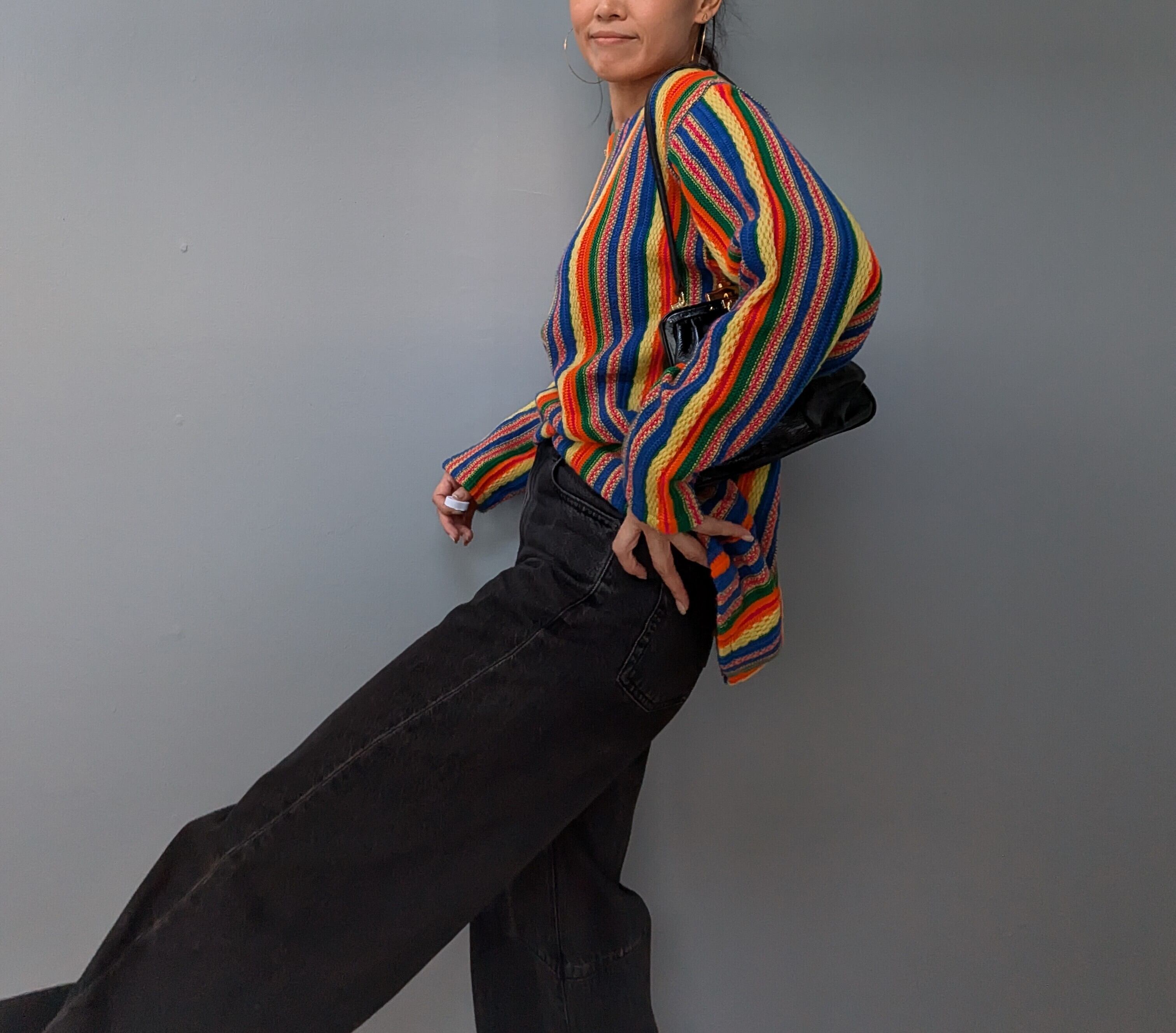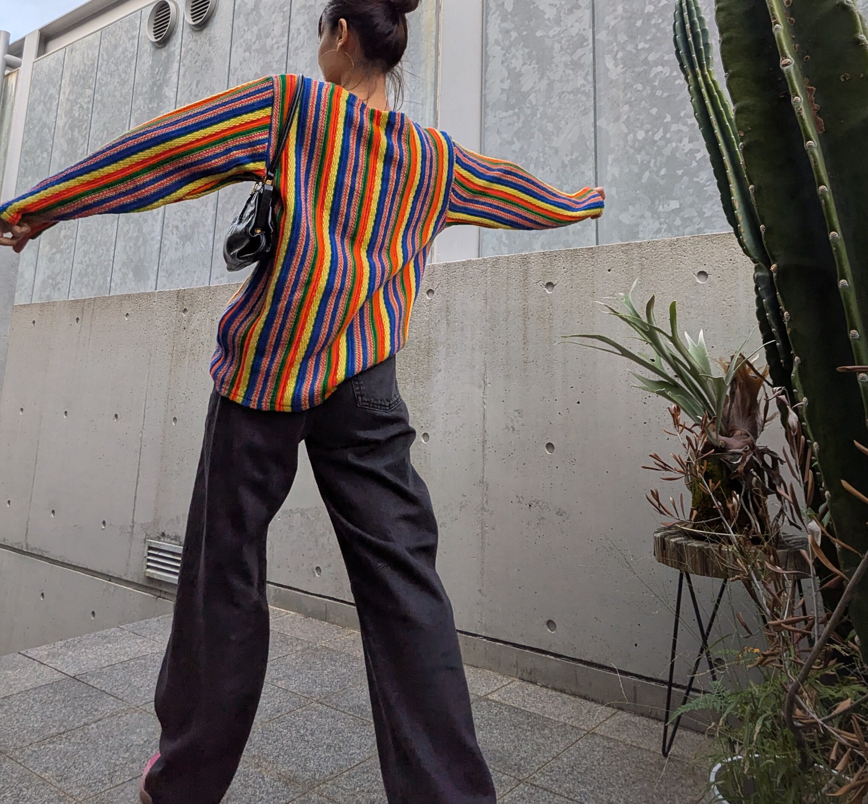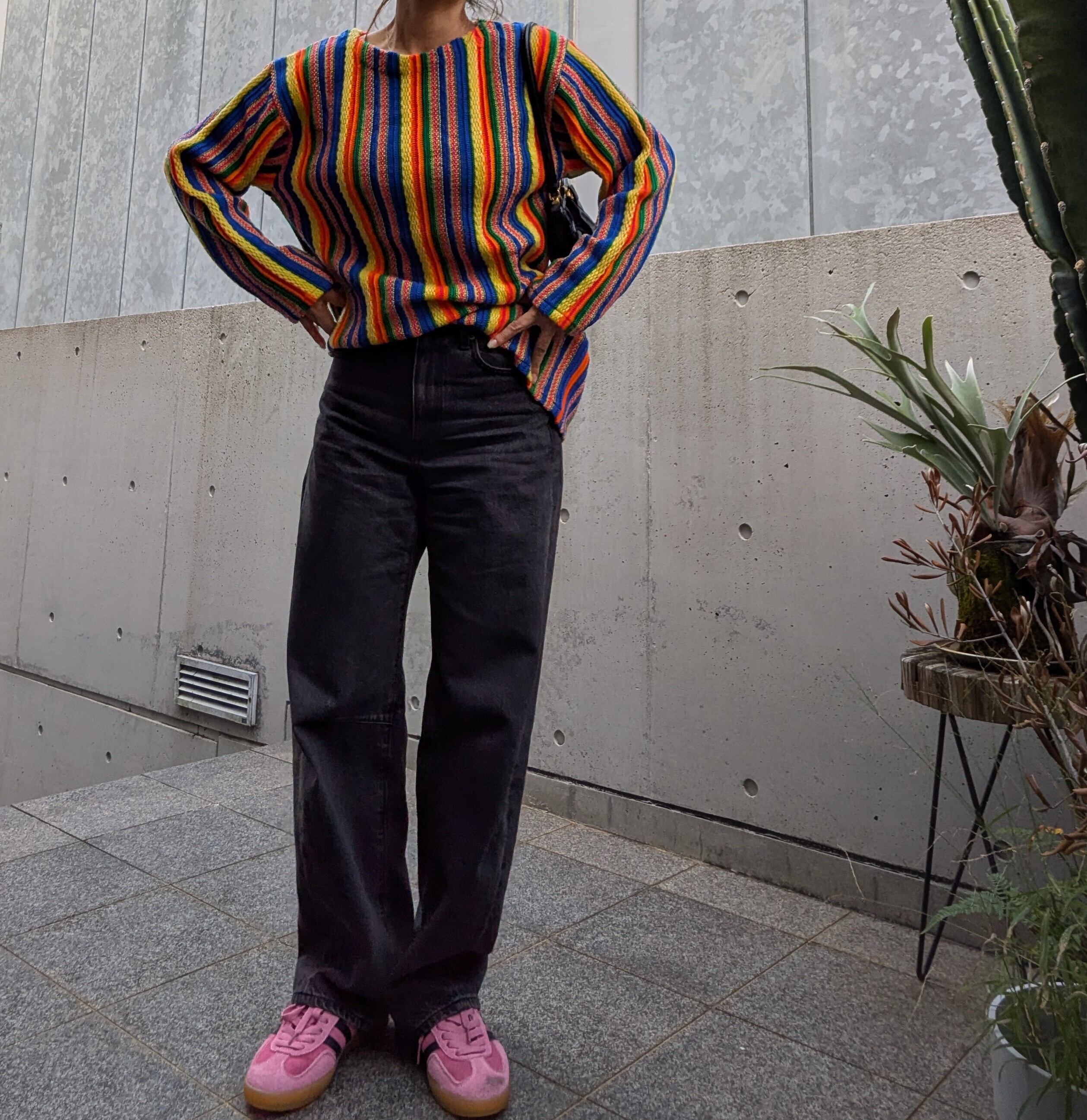 80年代日本製の華やかなマルチカラーのボーダーデザインが特徴のニットトップスです。鮮やかな色合いがコーディネートにアクセントを加え、シンプルながらもおしゃれな印象を与えます。
