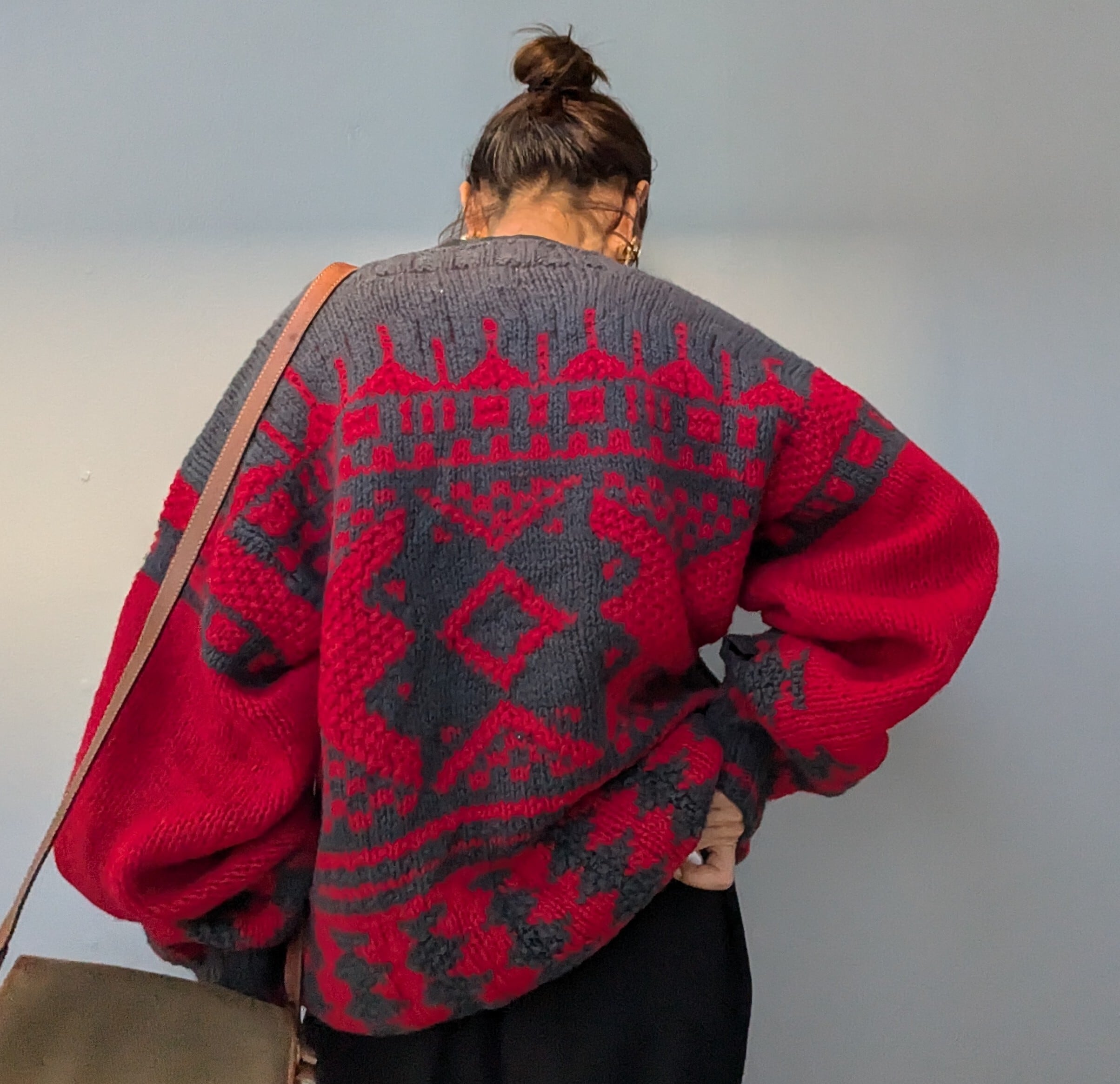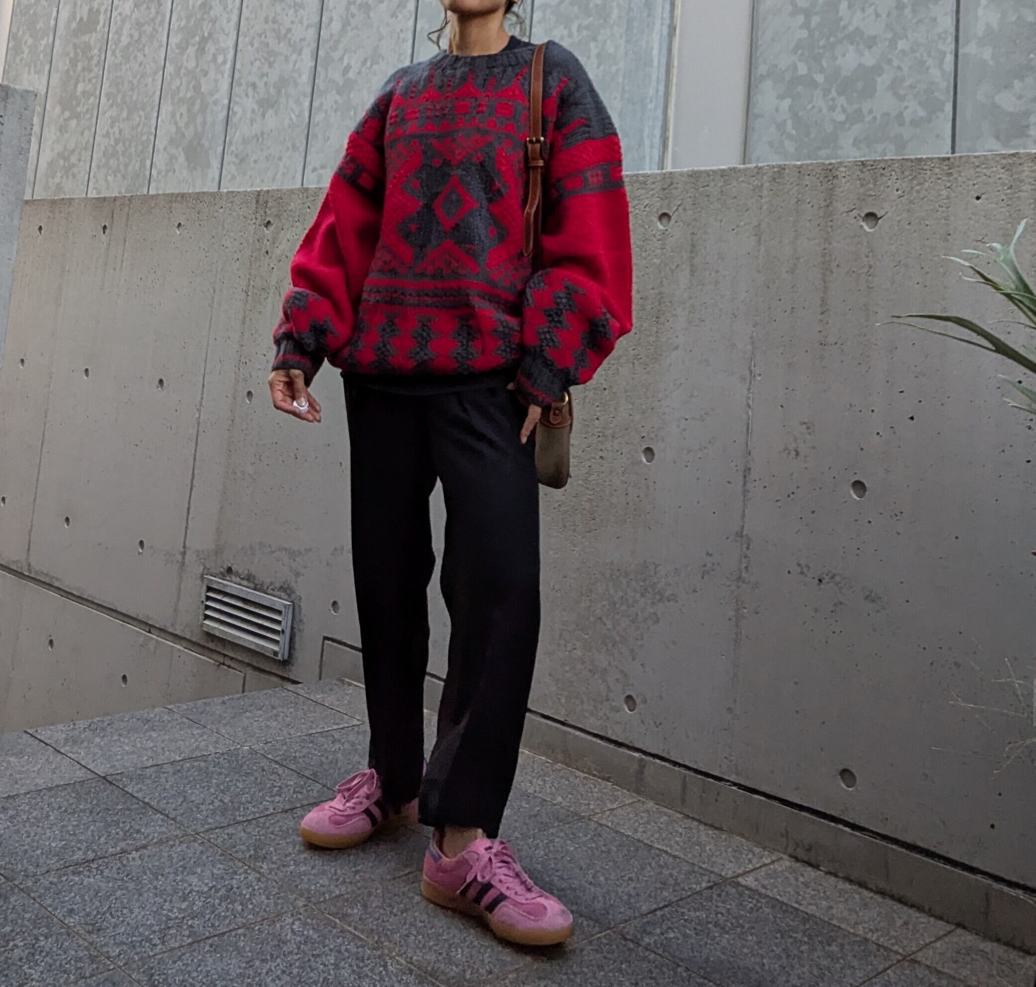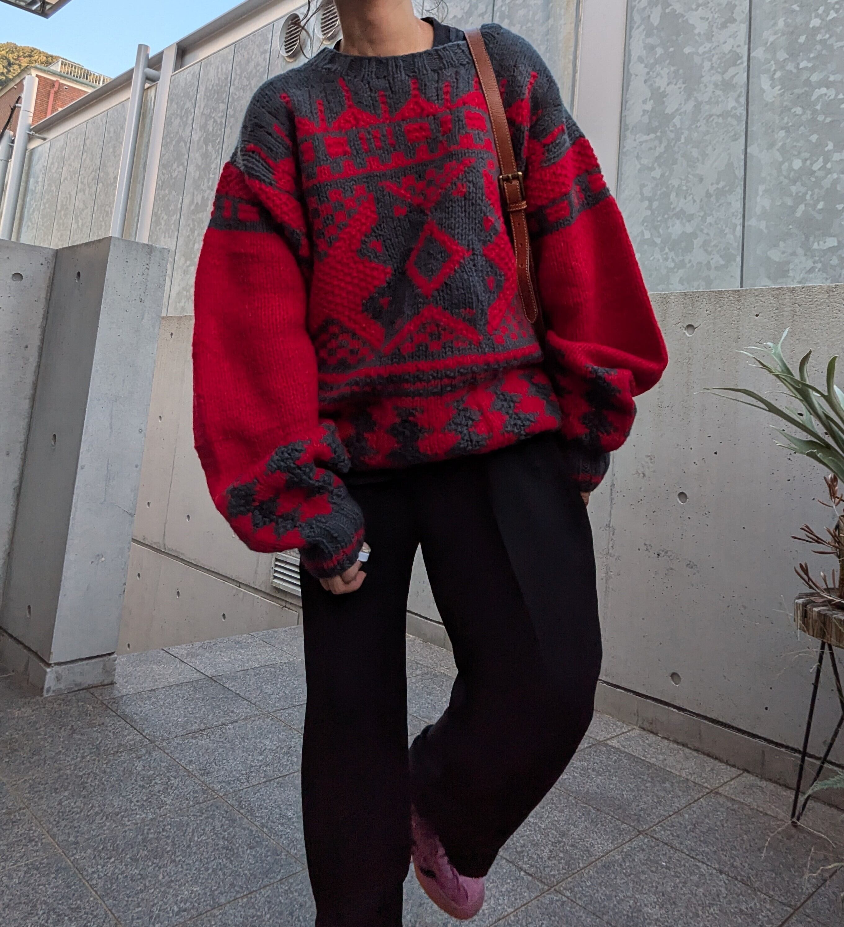 グレーと落ち着いたレッドカラーの組み合わせが大人っぽさと可愛いらしい雰囲気もあり、ゆったりふんわりとしたシルエットがデニムはもちろん、ロングスカートや、スラックスなど、ボトムを選ばず大人可愛いコーデに差し上げてくれます。大人カジュアルなスタイルにぴったりなとても素敵な1点物です。