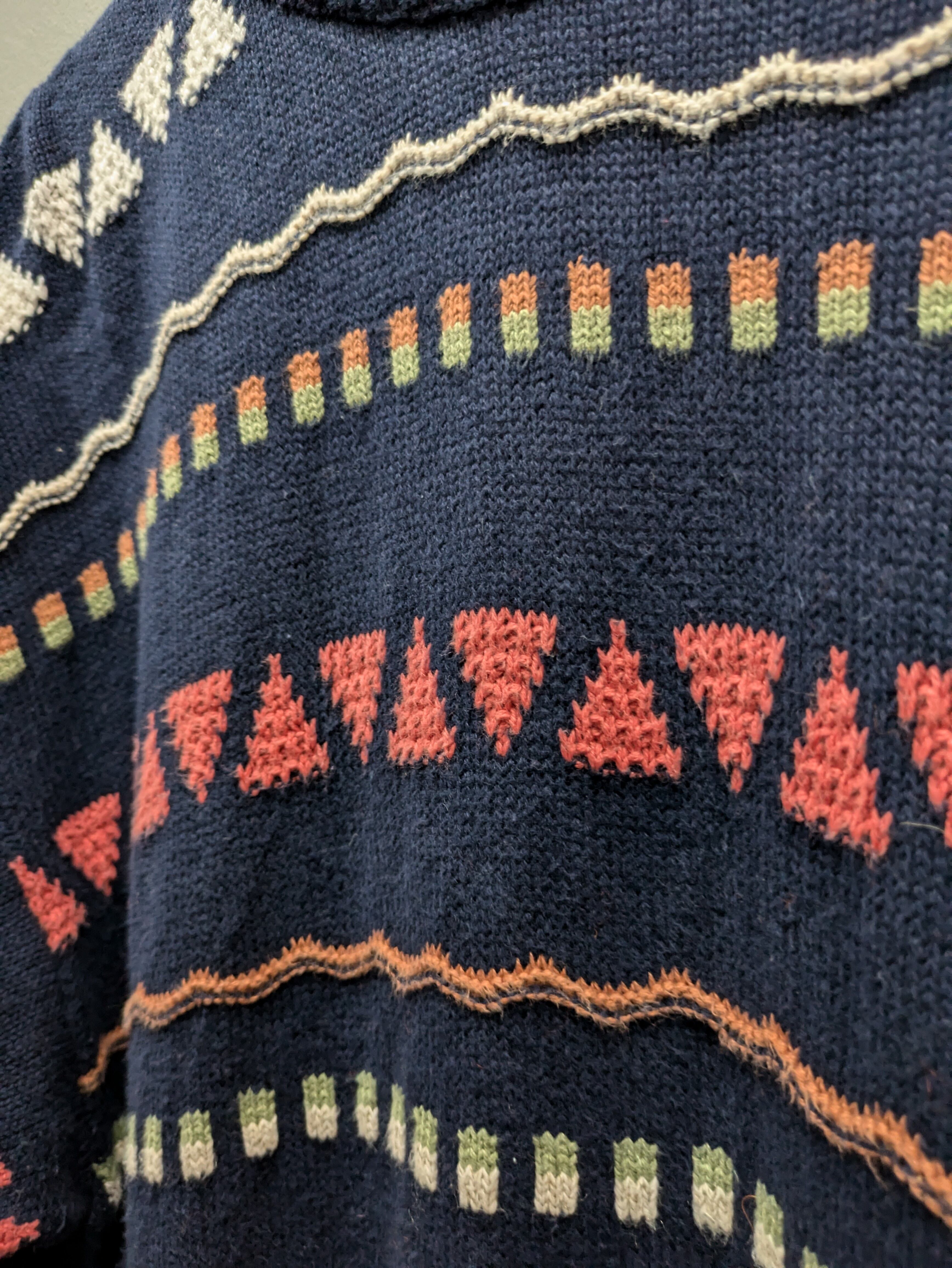 アメリカンヴィンテージのコットンニットプルオーバー。カラフルな配色と、柔らかいコットンニット素材が心地よい着用感で肌に優しくフィットします。レトロな雰囲気を醸し出すカラーリングと、可愛いトライアングル模様のデザインが魅力で、デニムやスカートなど、様々なボトムスとの相性も抜群です。リラックスしたゆったりとしたシルエットが特徴で、カジュアルからキレイめコーデまで幅広く活用できる一着です。