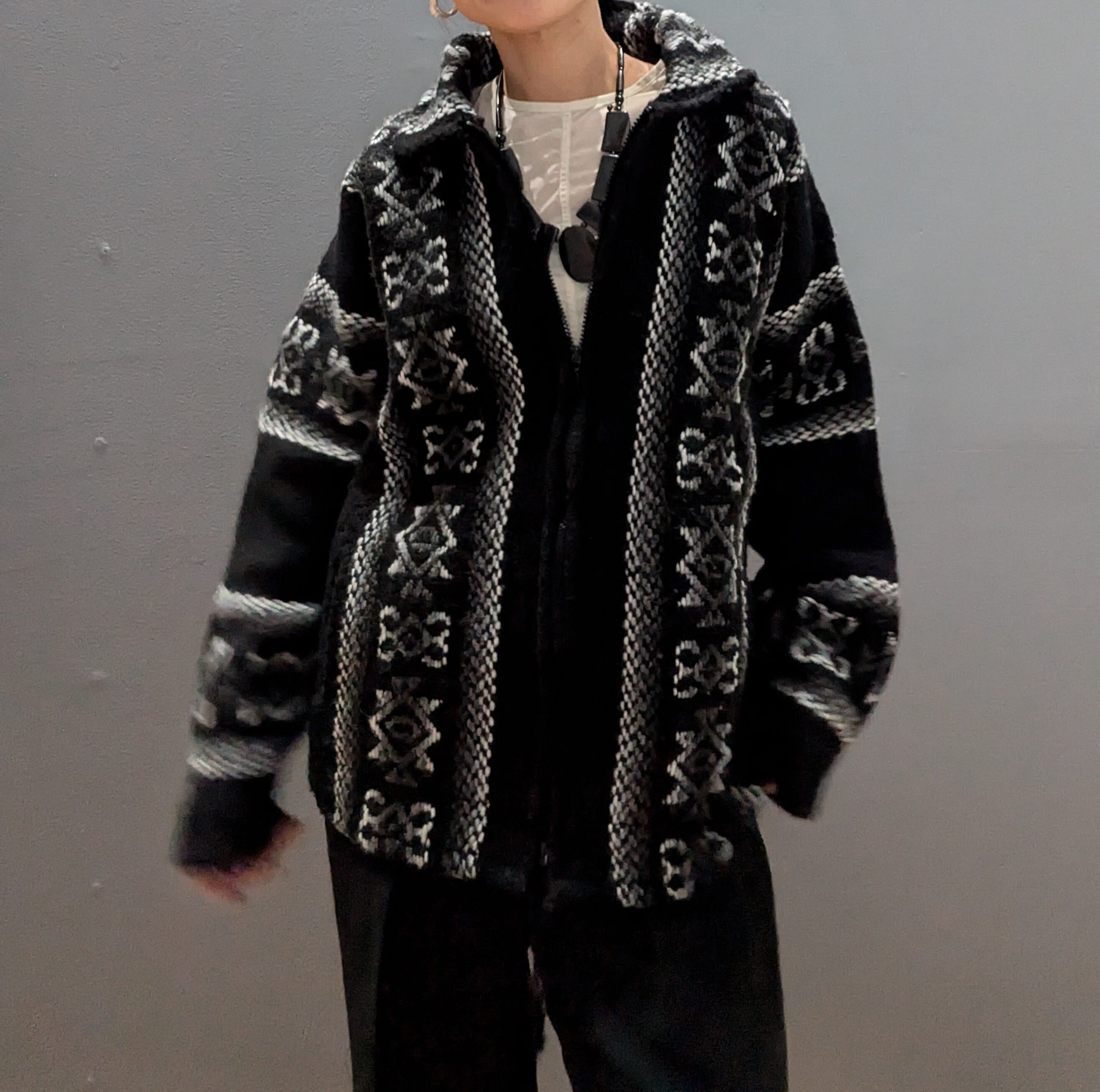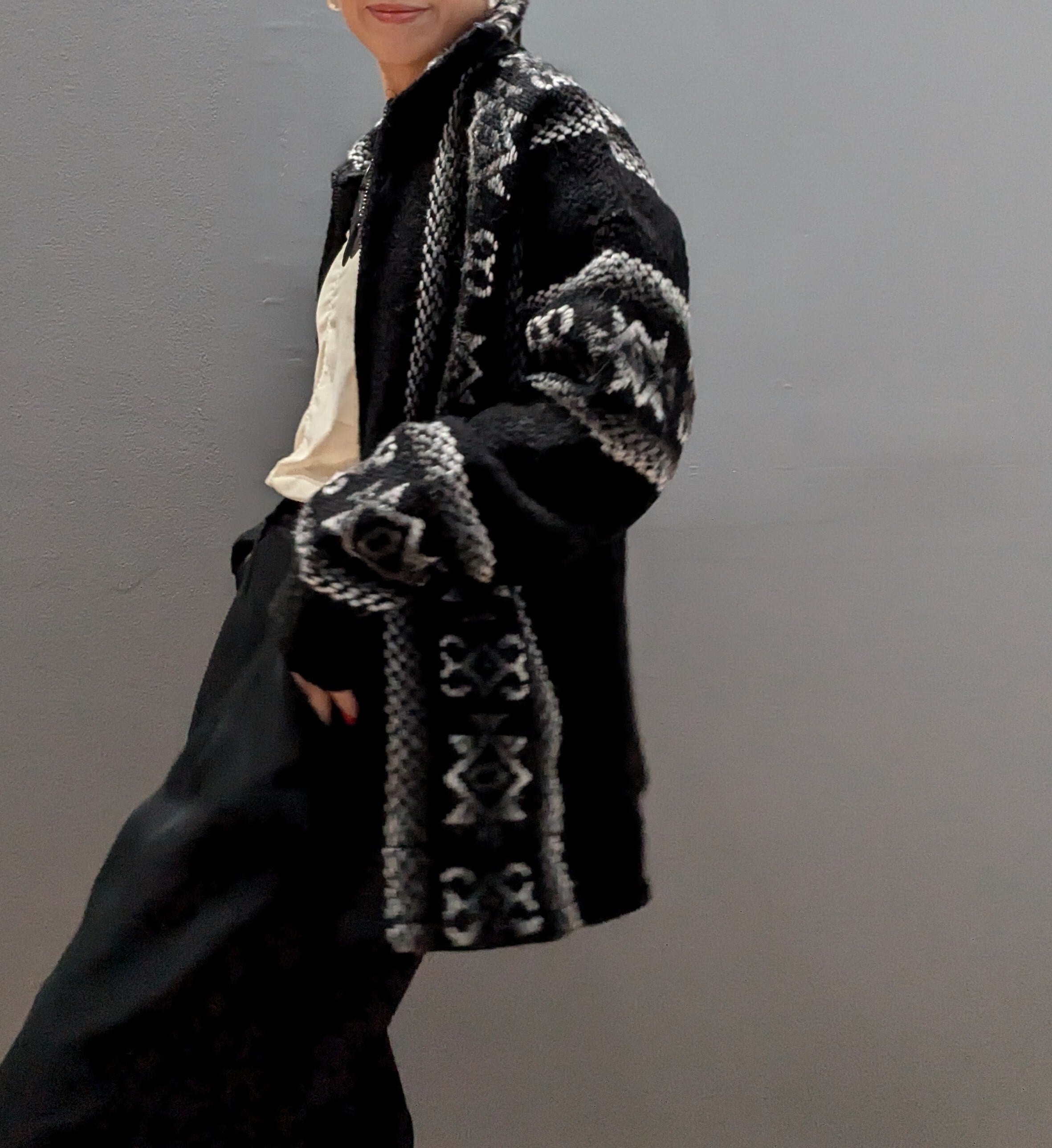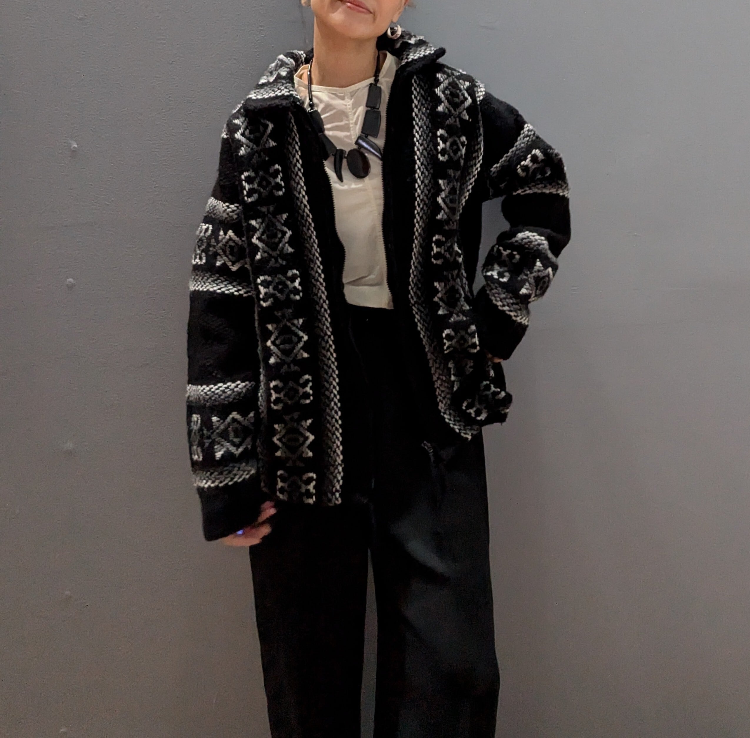 独特なデザインが魅力のUSA vintage woolカーディガン。しっかりとした肉厚のwool100%素材で、肌寒い日にもぴったりの一着です。