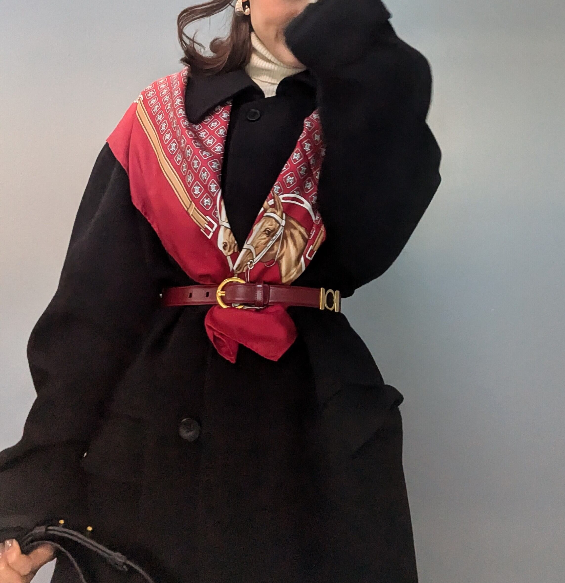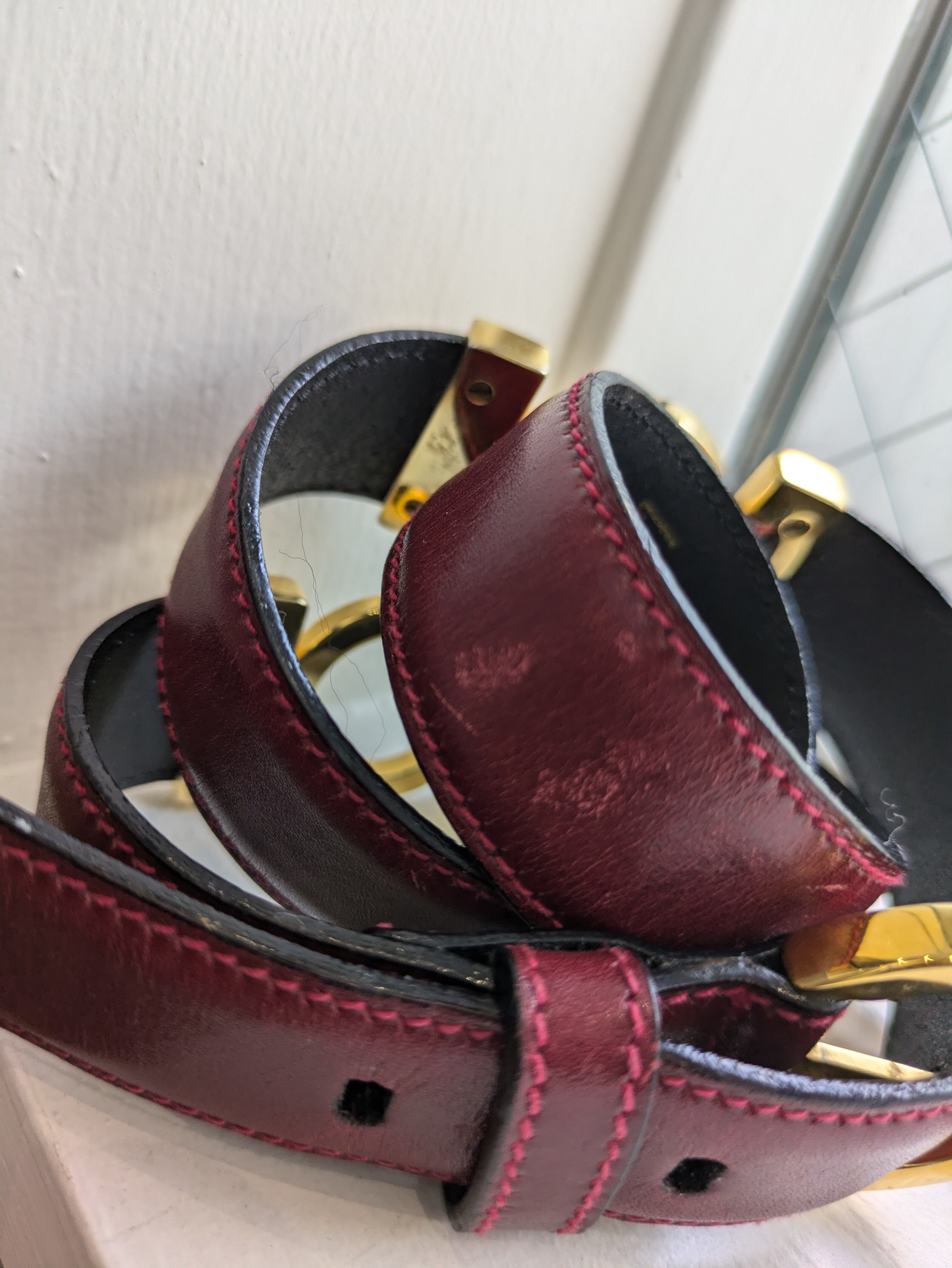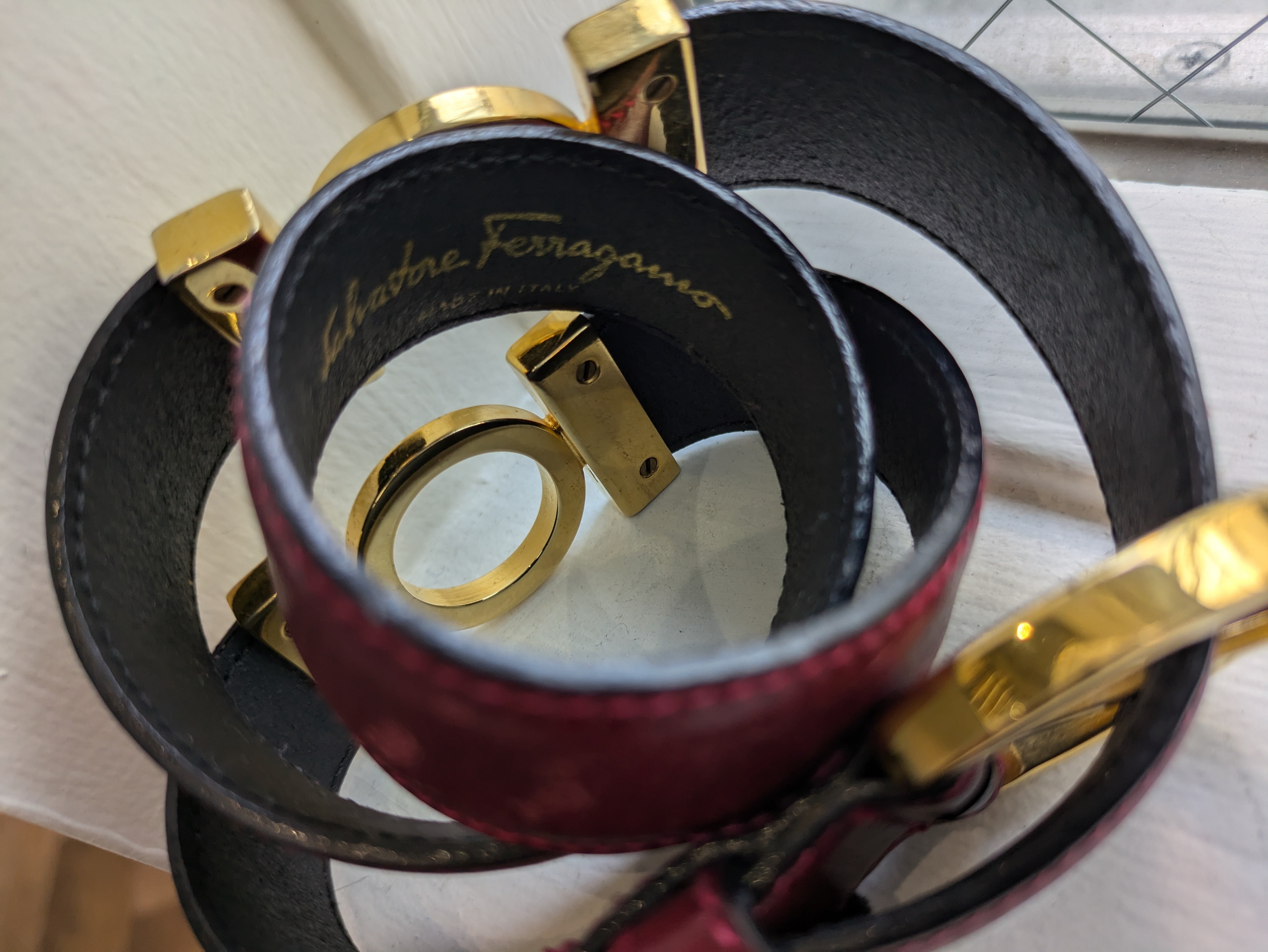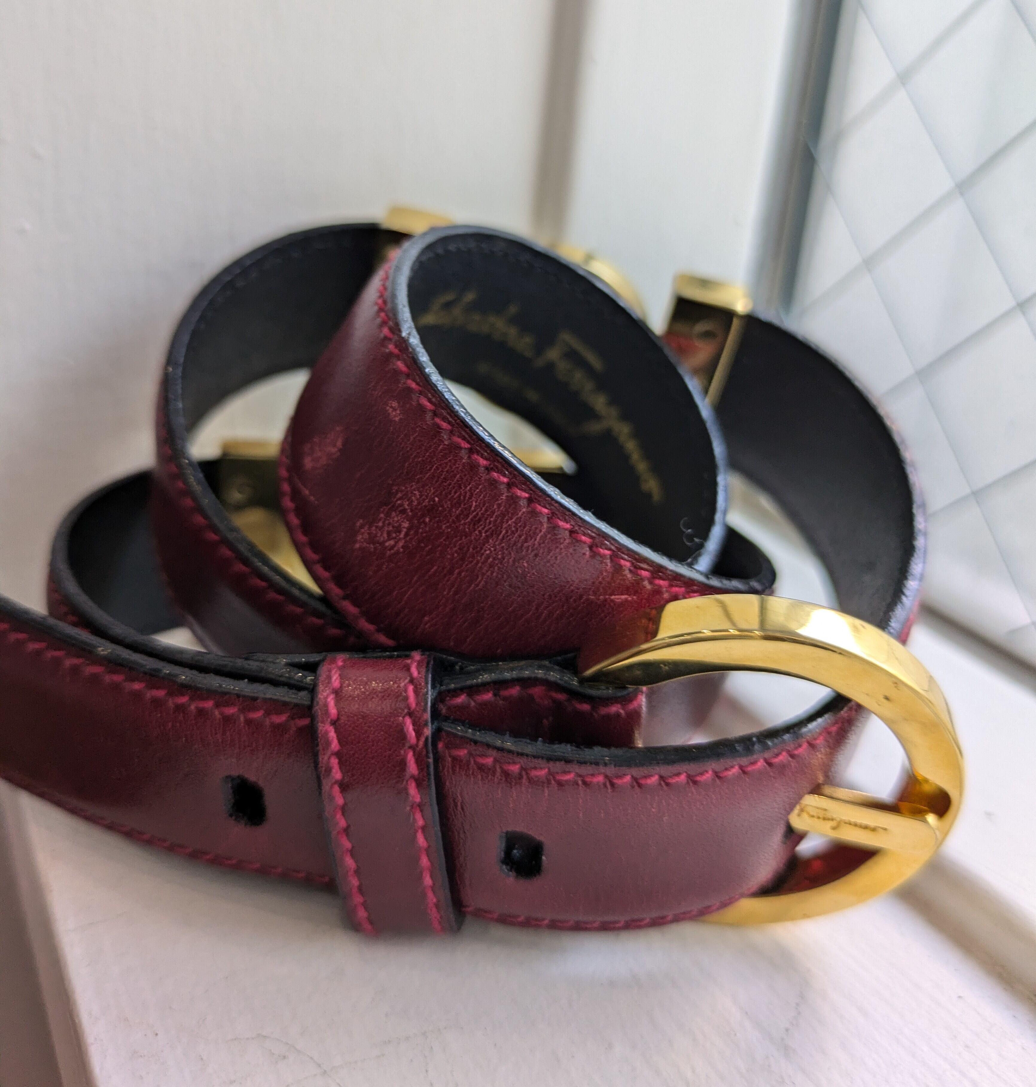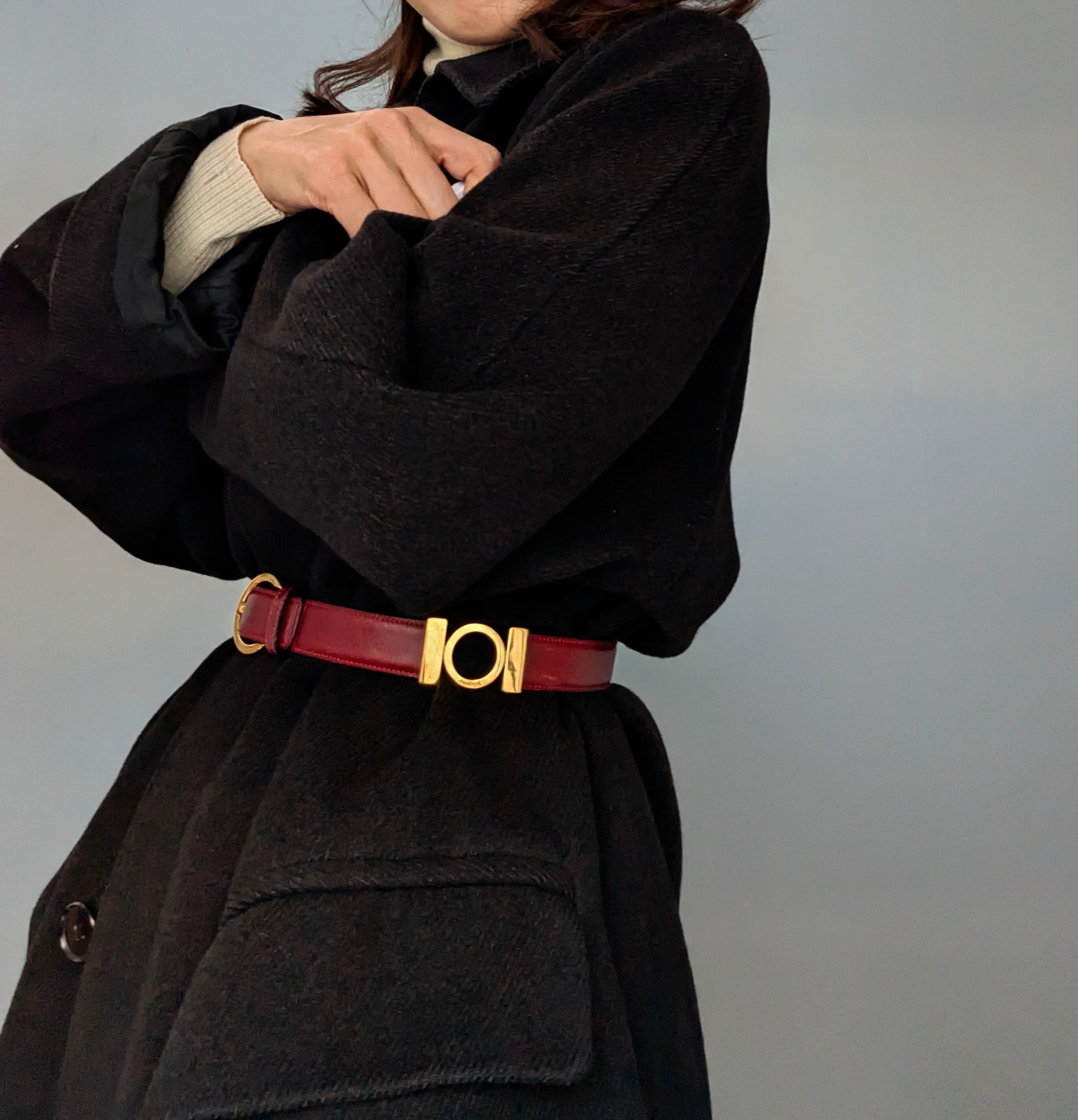 Salvatore Ferragamoのvintageレザーベルトです。深紅カラーにゴールドが映える高級感のあるデザインです。カジュアルからフォーマルなシーンまで、様々なコーディネートに活躍してくれる1点です。