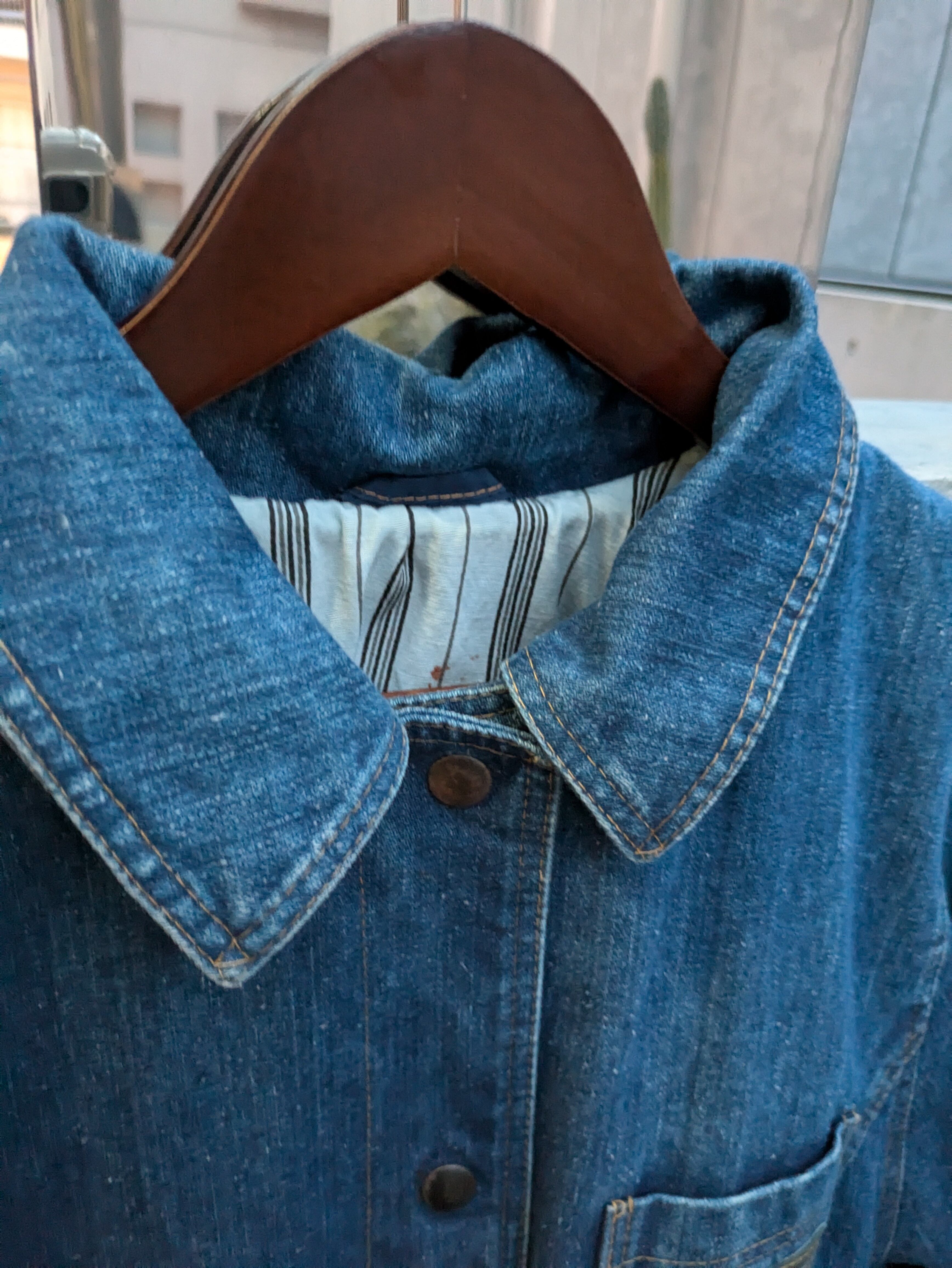 タフなデニム素材が魅力で、しっかりとした作りが特徴のロングカバーオール。