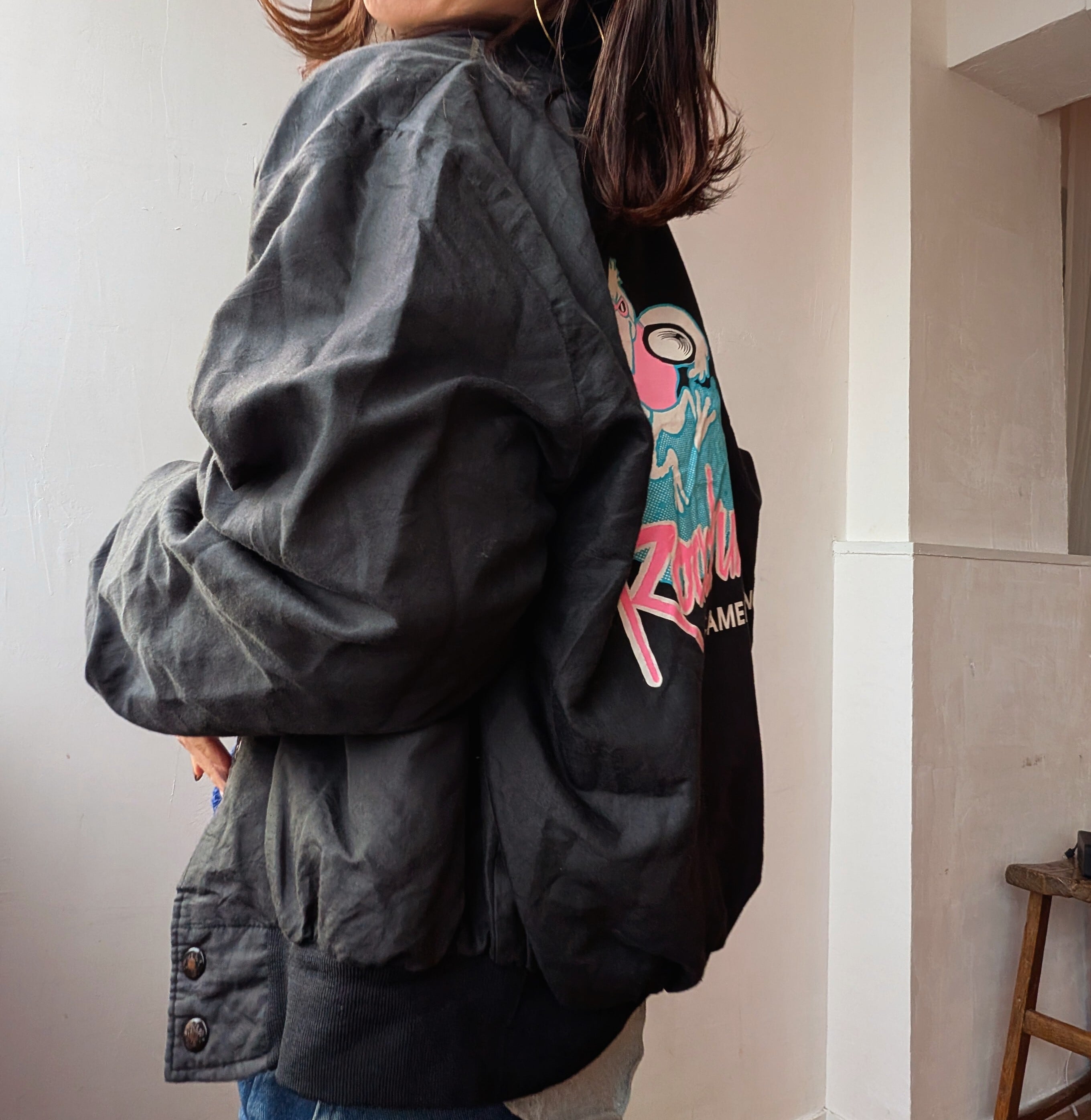 ビビッドな配色がかわいい、ファニーなイラストのバックプリントや、ゆったりとしたシルエットが特徴で、Tシャツやスウェット、デニムと合わせてリラックス感のあるスタイルを楽しむことができます。季節を問わず活躍し、アウターとしても重宝する1着です。